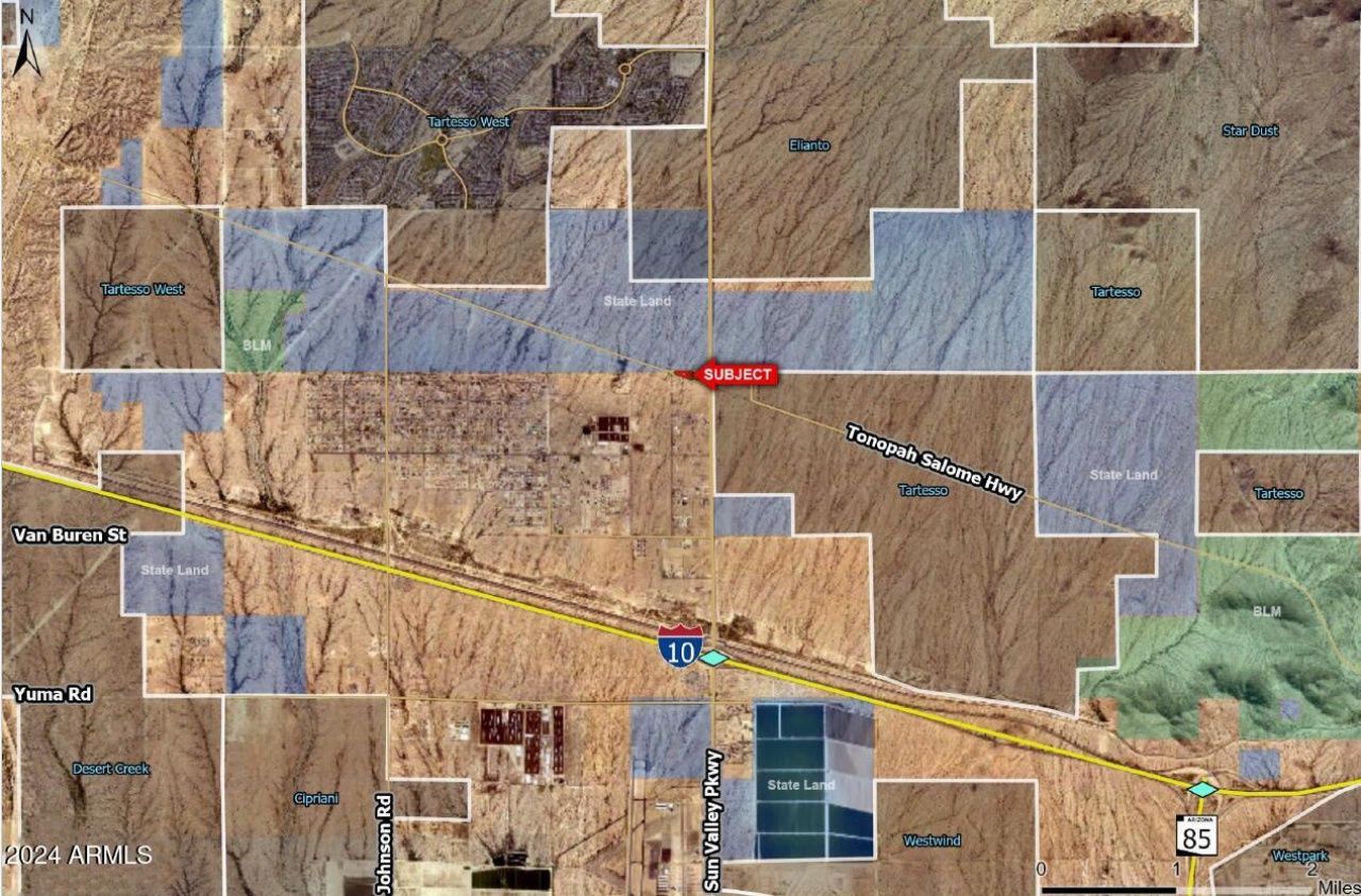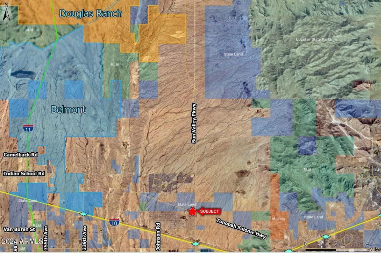 Excellent opportunity to develop commercial space in a vastly underserved part of West Buckeye. Ability to exclusively serve the entire local population, including the sold out 2,918 lot Tartesso Community to the North, the 336 lot West Phoenix Estates community to the West, as well as the incoming 100,000 home Teravalis community, whos residents will all access their homes via the Sun Valley Pkwy. As of today, the entire existing local population (approximately 10,000 people) travel to I-10 & Watson for the nearest commercial service. Teravalis, formerly known as Douglas Ranch, began construction on 10/28/2022 and will reportedly create 1.5 jobs for every home.