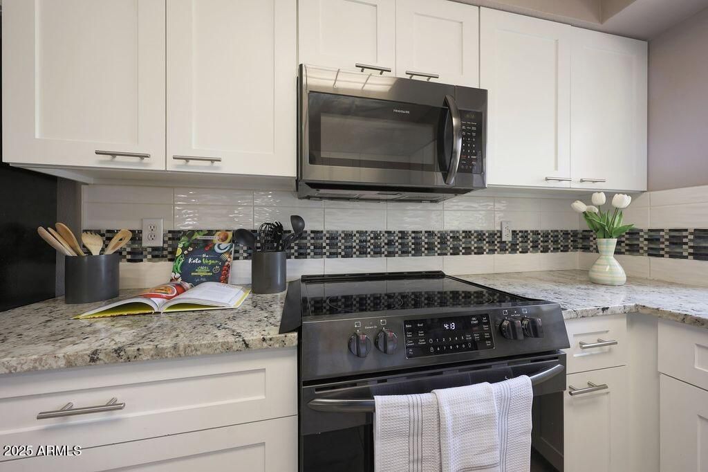 This rare find is a unbelievable value. This 3-bedroom, 2-bathroom second-floor condo offers ultimate privacy with no neighbors above and a peaceful, retreat-like setting.The nearly 200 sq ft private patio is a true standout--have a cup of coffee to start your mornings while enjoying stunning sunrises, then wind down in the evening with a glass of wine as you take in breathtaking Arizona sunsets, enjoy beautiful mountain views from the terrace, adding an extra layer of tranquility and charm to your outdoor living space. The kitchen is a chefs dream, the shaker cabinetry, granite countertops, custom tile backsplash, and sleek Frigidaire Gallery black stainless steel appliances are what you would expect from much more expensive homes. The style and quality of this home exceeds expectations!!! The primary suite is complete with a luxurious bathroom. It has a stand a-lone soaking tub which is perfect for relaxing after those long days. The primary suite is separate from the other bedrooms assuring maximum privacy.This complex is beautifully located near shopping, hospitals and offices. It is conveniently located close to the 101 freeway making it a snap to get around the Phoenix area.This is the perfect lock and go home for a winter visitor or for someone looking for carefree living with virtually no maintenance.