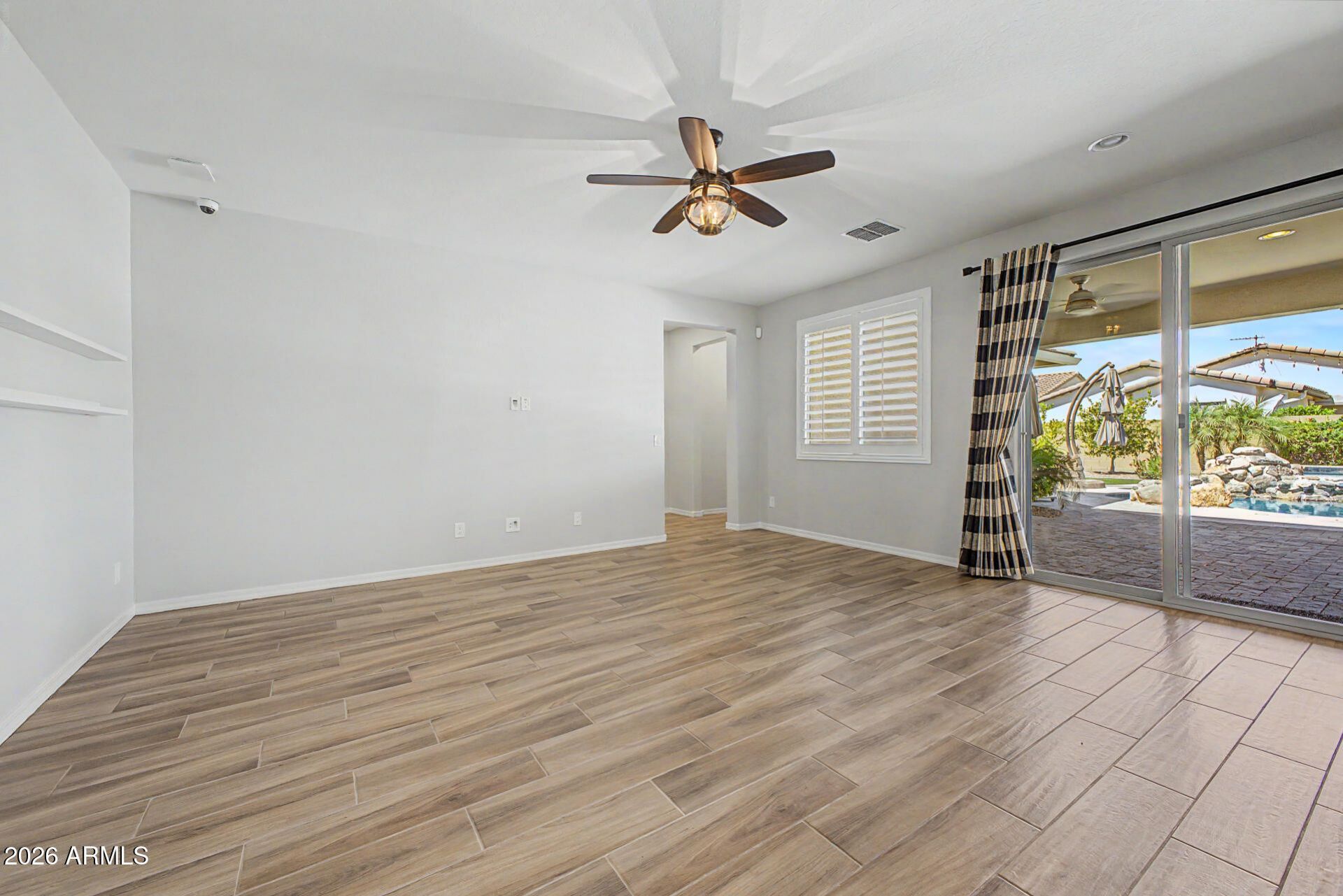 Home, sweet home! This lovely property in the adult Community of Encore at Eastmark features a 2-car garage, a tasteful paver extended driveway, & a charming brick facade. Inside, youll find a serene open layout w/ a soothing palette, classic plantation shutters, & wood-look flooring. The gourmet kitchen comes w/ granite counters, ample wood cabinetry w/ crown moulding, pendant/recessed lighting, a striking tile backsplash, stainless steel appliances, a pantry, & an island w/ a breakfast bar. Youll also find a versatile den ideal for an office or a study. The primary bedroom showcases soft carpeting, an ensuite w/ dual sinks, & a walk-in closet. Imagine enchanting evenings in the backyard, complete w/ a covered patio, pristine artificial turf, & a refreshing spa & pool.