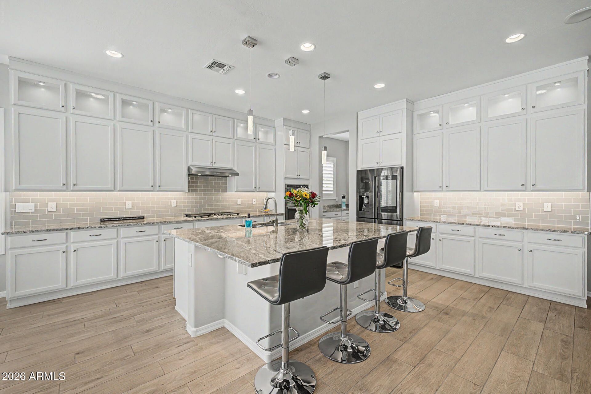 Perched on an elevated home site on the quiet cul-de-sac this 4 bed, 3.5 bath, modern custom upgraded luxury home offers panoramic city and breathtaking sunset views. The tandem garage fits 3 cars. The 8 X 6 granite gourmet kitchen counter features GE Profile appliances dual sinks, a 5 burner gas range, with the oven and microwave stacked for easy use. The entire kitchen area contains granite countertops that continue throughout the house to the 3 full baths. The separate dining area with a large butlers pantry flows through to the kitchen for ease in entertaining guests. The oversized kitchen spreads into the spacious living room and easily to the outside patio area. A custom built-in entertainment wall has surround sound, which continues outside to the patio area. (Click for more) The master suite boasts dual granite vanities and a custom walk-in closet. Two of the three additional bedrooms, have custom closets as well as built-in dressers. Enjoy the Resort style backyard with an 11,711 gallon heated pool you can control with ease of the touch of a button on your phone. The pool features a 41-foot fireplace that runs the length of the pool, the cabana area features its own fireplace which features include a 5-foot waterfall raining over you while sitting on the in-pool bench. The fire wall includes three cascading waterfalls and two bubbling fountains on the Baja shelf that accommodates 4-5 lounger chairs and 2 in pool umbrella stands. The pool area has travertine encompassing it as well as the patio and cabana. The landscape also has a 4-hole putting green all for entertaining with family and friends and a quiet morning sunrise while sipping your favorite morning brew.