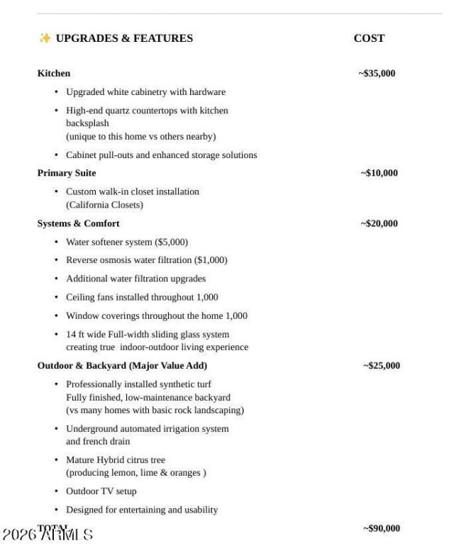 Beautifully upgraded 3-bedroom, 2-bath home with an open floorplan. The great room flows seamlessly into the kitchen and dining area, featuring white cabinetry, Quartz, pull-out shelves in the drawers, ample storage, and contemporary finishes, perfect for entertaining and everyday comfort.The spacious primary suite offers has a beautiful custom walk-in closet, walk in shower, and dual sinks. Secondary bedrooms are well-sized and versatile for guests, home office, or fitness space. Window coverings and ceiling fans throughout add comfort and efficiency.Enjoy upgraded water quality with a water softener and reverse osmosis system. Step outside to a low-maintenance backyard featuring synthetic grass, automatic underground irrigation, and a mature citrus tree already producing lemon Enjoy upgraded water quality with a water softener and reverse osmosis system. Step outside to a low-maintenance backyard featuring synthetic grass, automatic underground irrigation, and a mature citrus tree already producing lemon Minutes away from Schnepf Farms, Pecan Lake, Golfland Sunsplash