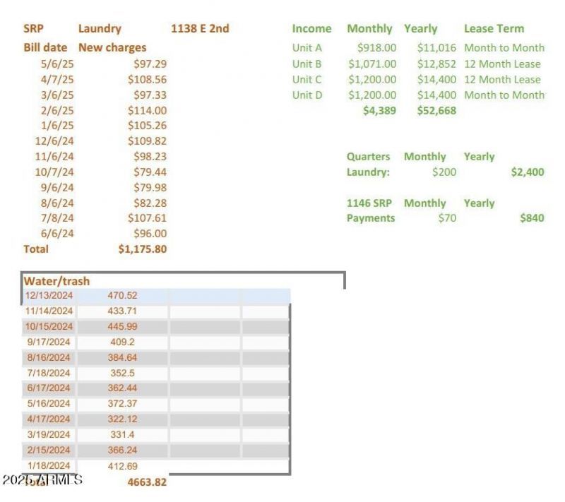 Prime Mesa Investment Opportunity! This 4-plex offers 4 spacious 2-bed, 2-bath, 1000sqft units with strong upside potential. First-floor units boast remodeled kitchens, all-tile floors, and large fenced yards. Upstairs, Unit D features vinyl floors and a remodeled kitchen; Unit C has a remodeled kitchen, laminate in living areas, and carpeted bedrooms. Most windows upgraded to vinyl dual-pane. Separate laundry building with owned coin machines generates ~$1,500/yr, plus tenant storage. Long-term tenants at below-market rents offer significant rent increase potential. Steps from light rail. Owner pays water, sewer, trash, and laundry power. See APOD in docs. Buyer/agent to verify all info. Act now for great cash flow potential!