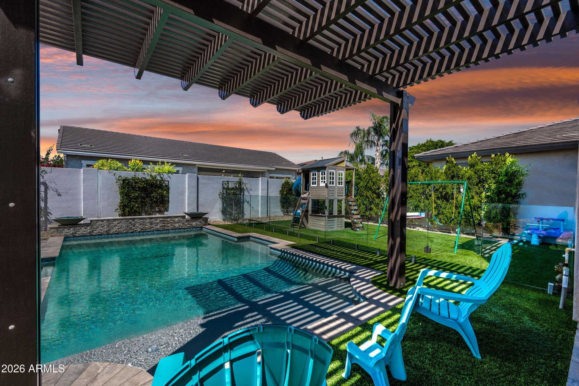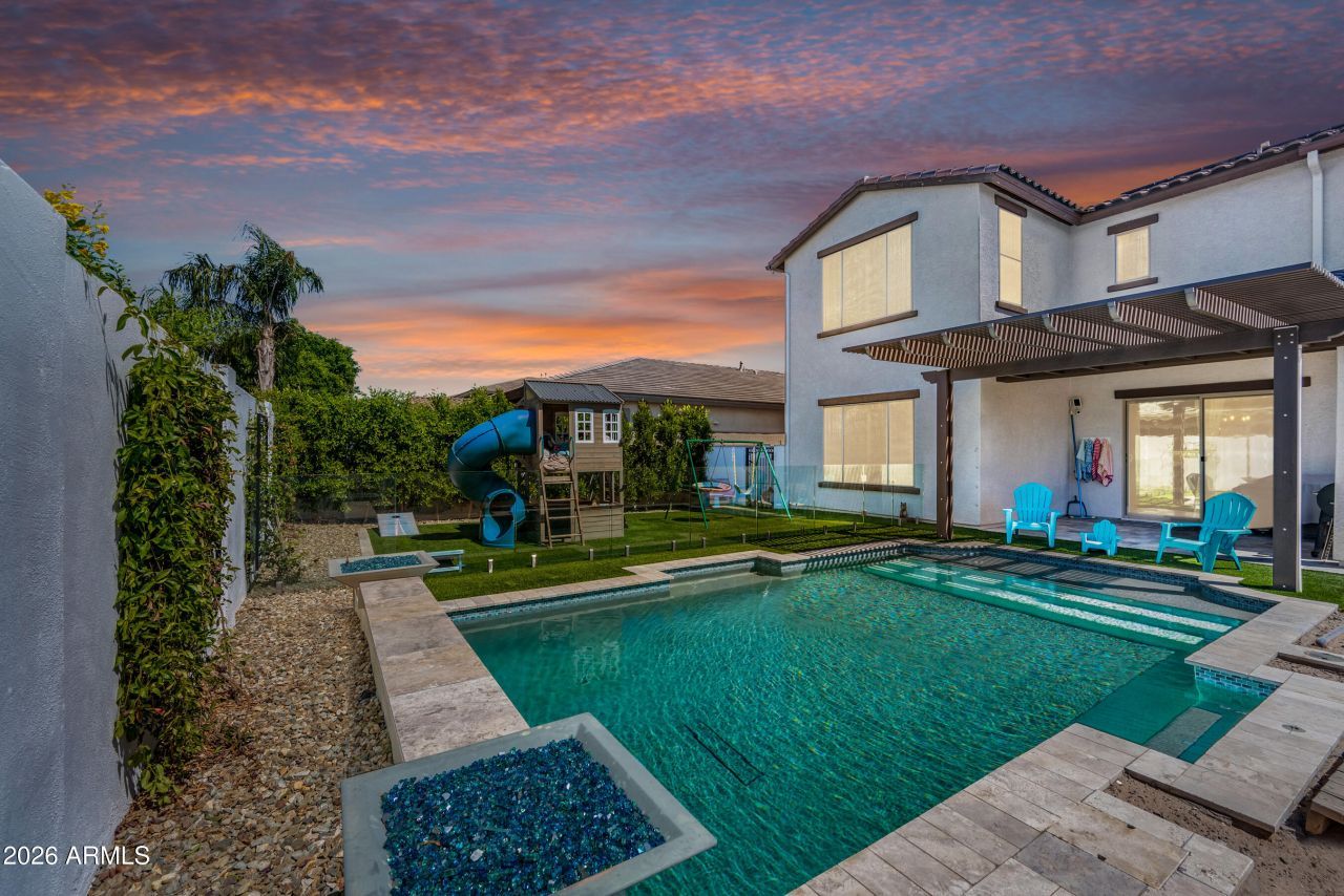 This stunning residence in the highly sought-after Marley Park community of Surprise, AZ, offers luxurious modern living in one of the areas most desirable master-planned neighborhoods. Nestled amid tree-lined streets, over 140 acres of parks and open space, themed playgrounds, walking paths, and community amenities that foster a vibrant, friendly atmosphere. This home delivers exceptional curb appeal and sophisticated upgrades throughout.Spanning an impressive 3,880 square feet, this two-story gem features 5 spacious bedrooms, 3.5 baths, and a 3-car garage--perfect for growing families or those who love to entertain. Step inside to discover a gorgeous chefs kitchen designed for both style and function: sleek quartz countertops, premium stainless steel appliances, a large central island for casual dining and prep, abundant upgraded white cabinetry, a convenient walk-in pantry, and beautiful wood-like ceramic tile flooring that flows seamlessly throughout the main level. Custom shutters add elegant finishing touches.The main floor includes a versatile guest bedroom with an adjacent half bath, ideal for visitors or multi-generational living.Upstairs, retreat to the expansive master suite--a true sanctuary with generous space, an oversized walk-in closet, and a spa-like master bathroom boasting dual sinks, a deep soaking tub, and a separate walk-in shower. Two additional bedrooms share a convenient Jack-and-Jill bathroom, while the remaining bedroom offers flexibility. A massive game room/loft provides endless possibilities for play, media, or hobbies, and a cozy reading room opens directly to a huge front balcony--perfect for morning coffee with views of the neighborhood.Outside, the backyard is an entertainers dream: a heated Pebble Tec play pool sparkles under the Arizona sun, surrounded by low-maintenance synthetic grass areas and extensive beautiful travertine pavers. A charming pergola connects to the covered patio and is thoughtfully plumbed for a waterfall feature, creating a serene oasis for relaxation or gatherings.Energy efficiency reaches new heights with a fully paid-off solar panel system--no leases or loans to assume! This owned solar setup harnesses Arizonas abundant sunshine to dramatically reduce (or even eliminate) monthly electric bills, while adding significant value to the home and offering eco-friendly, sustainable living without ongoing payments. The home also features rain gutters with French drains, providing excellent water management and peace of mind during monsoon season. The 3-car garage is just as impressive, featuring durable epoxy flooring and abundant lighting for a clean, organized space that matches the homes high-end feel.Located in the community-focused Marley Park--known for its abundant parks, pools, splash pads, and neighborly vibe--this home combines luxury upgrades with an unbeatable lifestyle. This home is also right around the corner from the highly sought-after Legacy Traditional School, a top-rated tuition-free K-8 charter school. Dont miss this rare opportunity!