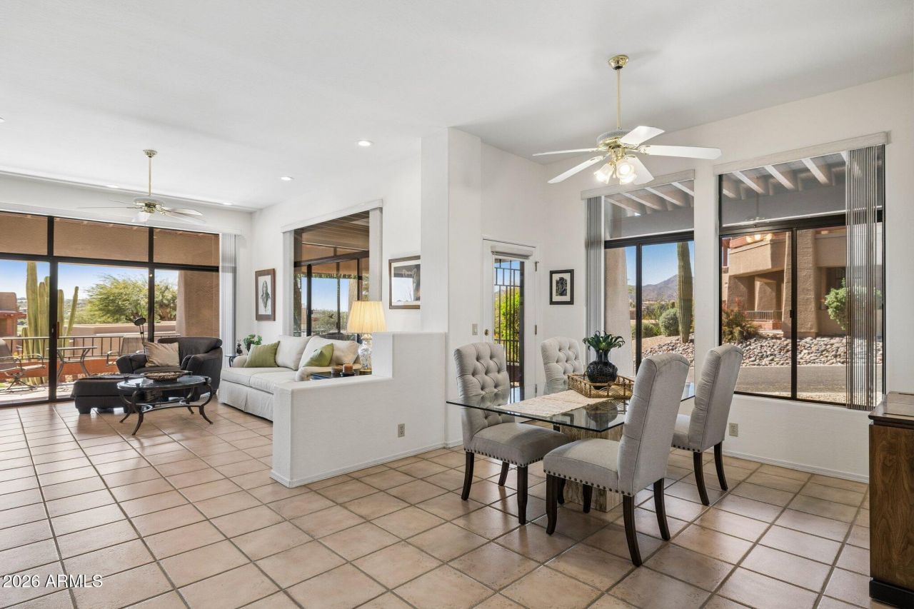 Overlooking Americas Tallest Fountain and Fountain Park, this ground-floor, 3-bedroom, 2-bath condo in gated Fountainhead offers stunning Fountain and Red Rock Mountain views. Ideal for seasonal or full-time living, the bright great room features a wood-burning fireplace, expansive windows, and seamless access to a large wraparound covered patio for indoor-outdoor living. The large kitchen allows seamless entertaining. Two bedrooms plus den, including one en-suite with patio access. Two-car garage. Community clubhouse, heated pool, and spa. Walk to the Overlook Trail, dining, and shops. Select furnishings available. Very stylish and livable, but also perfect for an update!