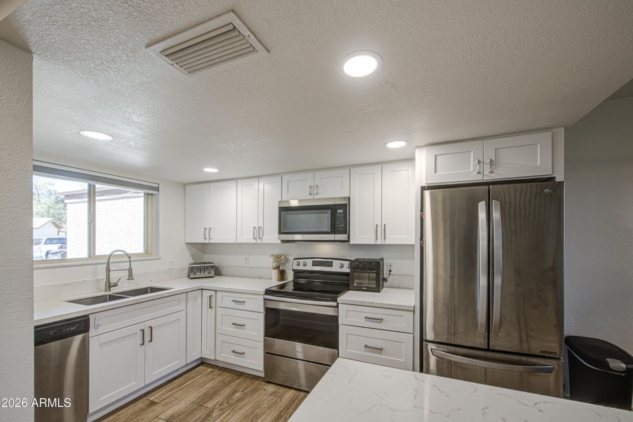Charming and well-maintained townhouse in a highly desirable location close to top-rated schools, parks, shopping, dining, and just minutes from I-17. The home features an upgraded kitchen with quartz countertops, contemporary cabinetry, a center island, and recessed lighting. Enjoy soaring cathedral ceilings in the living room that create a bright and open feel. The flexible floor plan offers 2 bedrooms and 2 bathrooms on the main level, plus a spacious upstairs bedroom that can easily serve as an office, game room, or media space. Step outside to a cozy private patio, perfect for relaxing or entertaining. Ideal for first-time buyers or as a strong rental investment. Move-in ready and full of potential, dont miss this opportunity.