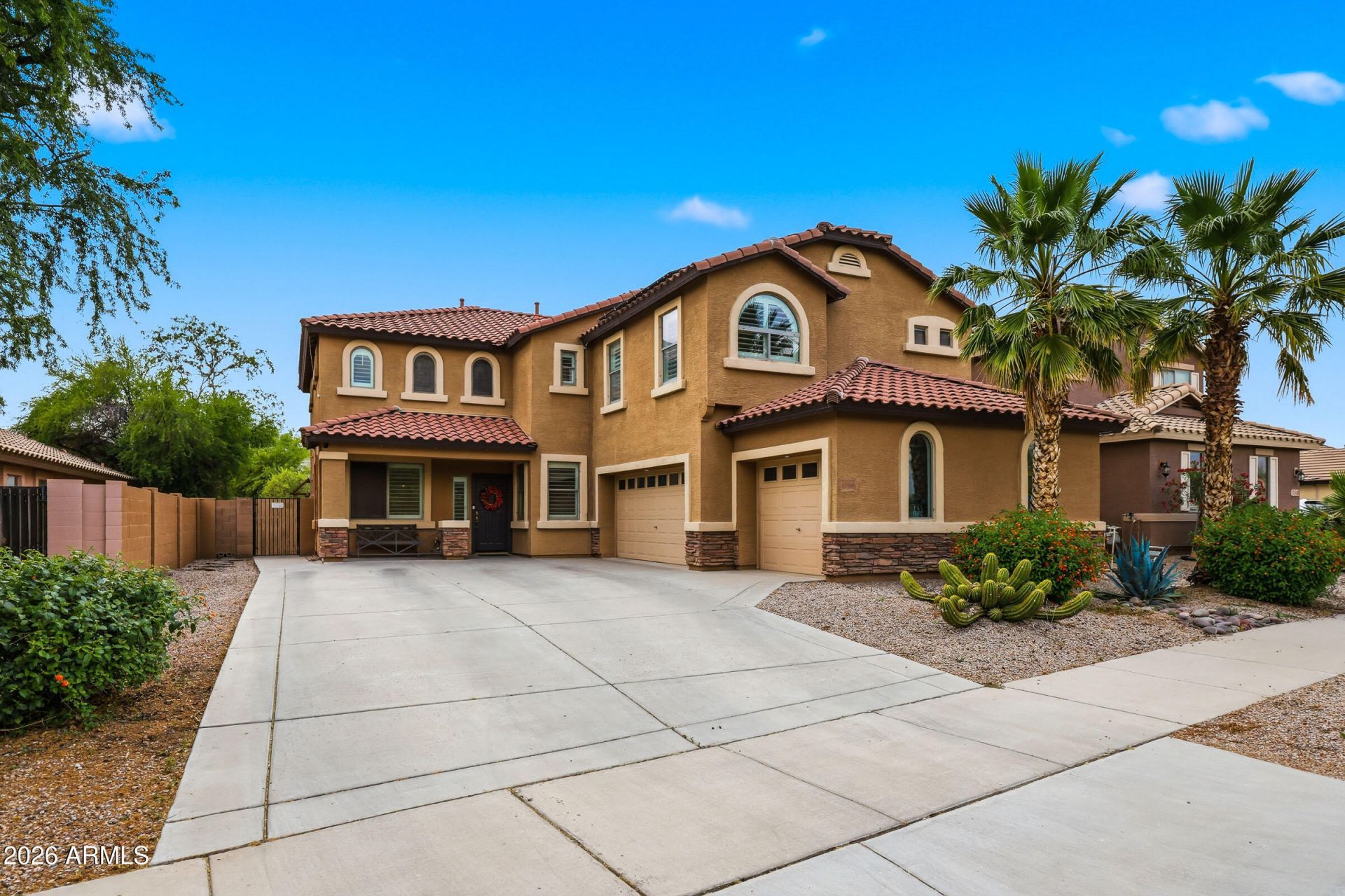Completely paid-off solar system! Perfectly situated on a tree-lined street overlooking a beautiful greenbelt, this D.R. Horton Cunningham plan offers space, style, and function in all the right places. A private entry opens to soaring 18 ceilings in the family room, with designer details, neutral finishes, and low-E dual-pane windows throughout. Split floor plan with formal living, dining, and loft spaces. Granite kitchen with stainless appliances, eat-at island, and breakfast nook. Spacious primary suite with sitting area. Backyard features a pool, spa, covered patio, and turf. Close to shopping, dining, SR 303, Sterling Grove, and golf.