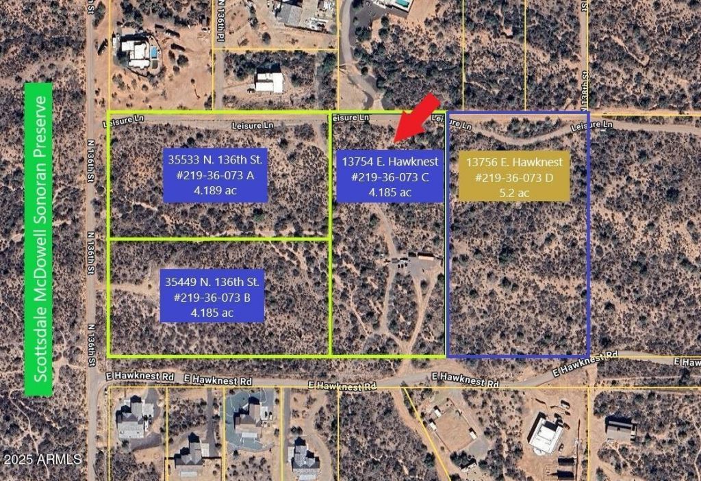 PRIME LAND! RIO VERDE FOOTHLLS: 4.2 ACRES, APN #219-36-073C. Near Scottsdale McDowell Sonoran Preserve & Tonto National Forest! Potential 4 lot split. Level, perfect for spec. homes,custom homes or ranch. Enjoy panoramic views of 4 Peaks,Granite Mt., & other majestic mt. ranges.Water wells & new homes nearby. Also avail.: #219-36-073A, 4.189 ac, Borders preserve,$295K, MLS #6883793. (SOLD- #219-36-073B, 4.185 ac, Borders preserve, elevated homesite, $315K). #219-36-073C, 4.185 ac., level, $305K, MLS #6883785. Adjacent #219-36-073D, 5.2 ac.,$350K,MLS #6883779,sep. owner/sep. contract.