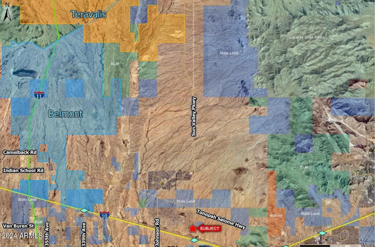Excellent opportunity to develop commercialspace in a vastly underserved part of WestBuckeye.Ability to exclusively serve the entire local population, including the sold out 2,918 lot Tartesso Community to the North, the 336 lot West Phoenix Estates community to the West, as well as the incoming 100,000 home Teravalis community, whos residents will all access their homes via the Sun Valley Pkwy. As of today, the entire existing local population (approximately10,000 people) travel to I-10 & Watson for the nearest commercial service.Teravalis, formerly known as Douglas Ranch, began construction on 10/28/2022 and will reportedly create 1.5 jobs for every home.