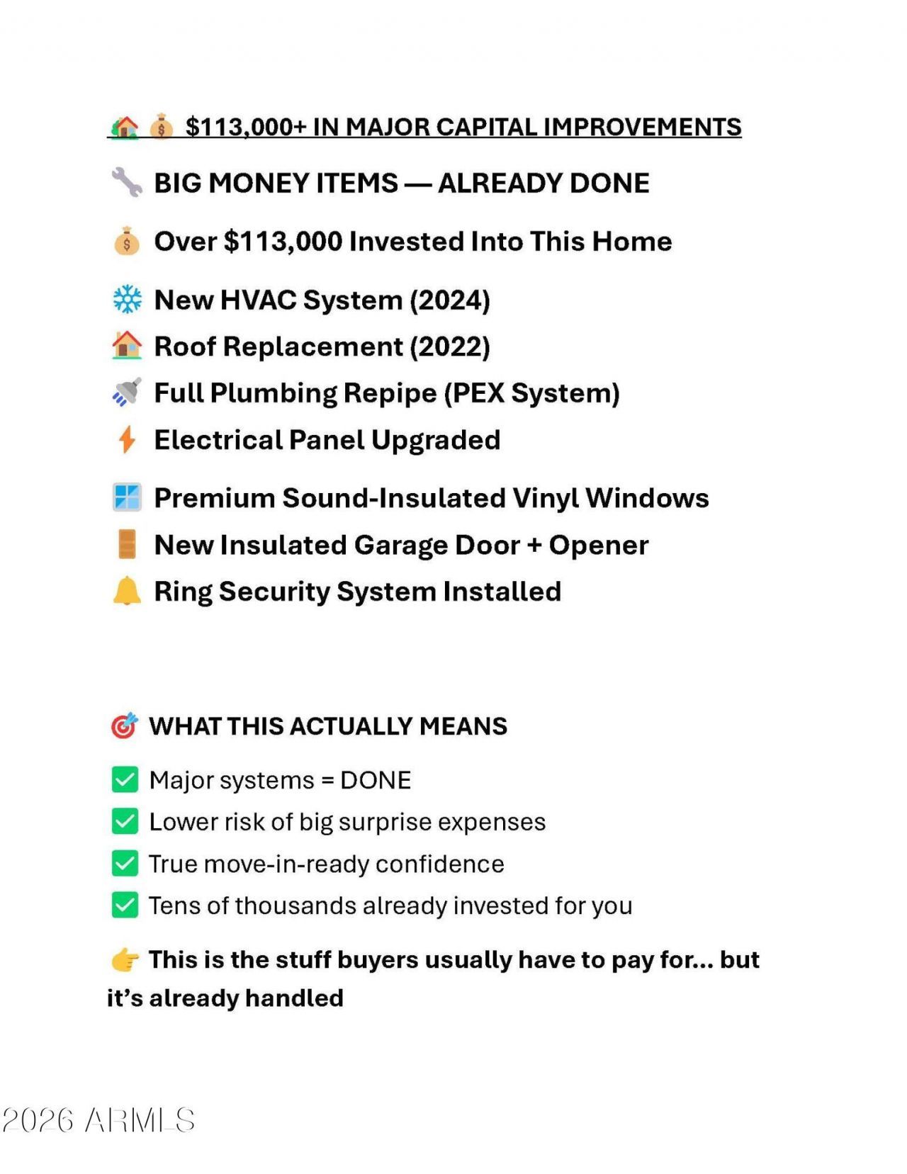 Rare opportunity to own an extensively upgraded Kingswood Parke home with over $113,000 invested in MAJOR CAPITAL improvements, including new HVAC (2024), roof replacement (2022), full plumbing repipe, electrical panel upgrade, premium sound-insulated vinyl windows, and a fully remodeled kitchen.Inside, vaulted ceilings and abundant natural light create a bright, open living space that flows seamlessly into the beautifully updated kitchen featuring solid wood two-tone cabinetry with soft-close doors and drawers, quartz countertops, a large island, and black stainless appliances--perfect for everyday living and entertaining. The spacious primary suite offers dual sinks, a walk-in closet, and private bath, while two additional bedrooms provide flexible space for guests, family, or a home office.Where this home truly stands out is the major system upgrades already completed. Many of the most expensive replacement items buyers typically face in homes of this era have already been addressed, including the roof, HVAC system, plumbing system, electrical panel, and windows.Energy efficiency is another major advantage. The solar system produces approximately 15,700 kWh annually and offsets about 109% of estimated usage, helping keep the combined APS and solar cost averaging around $220 per month, even with the home typically cooled to 72 degrees.Outside, the private low-maintenance backyard with covered patio offers a comfortable space to relax or entertain.Homes in this price range rarely include this level of infrastructure upgrades and energy efficiency improvements.Detailed improvement documentation available in the MLS documents tab.