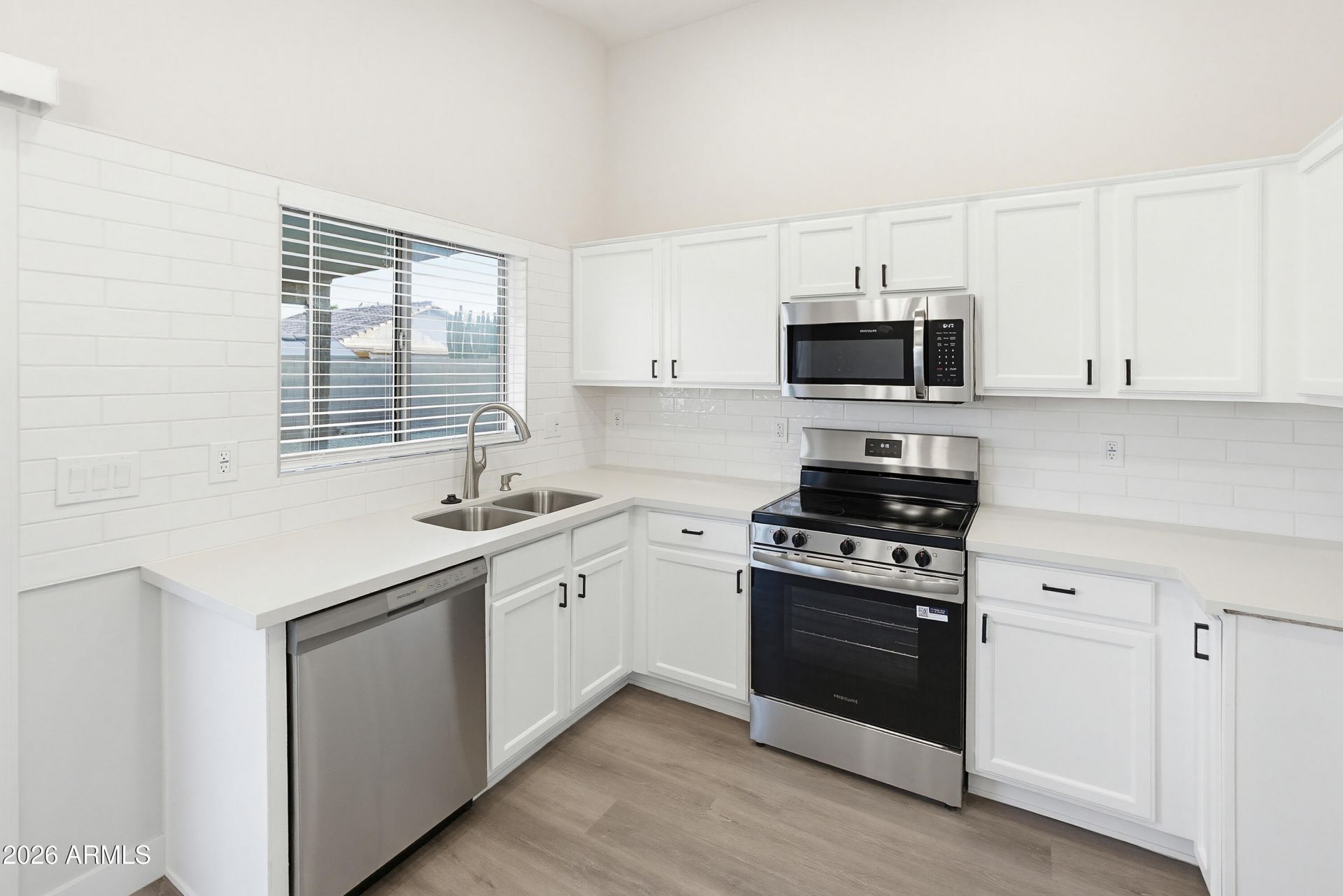 This beautifully remodeled home challenges comparison! From the bright, open floor plan with vaulted ceilings to the backyard oasis with low-maintenance synthetic grass, covered patio, and garden beds with a backyard auto-timer watering system that youll love!! The kitchen features luxury Calacatta quartz countertops, pantry, subway tile backsplash, stainless steel appliances, and recessed lighting. Other features include new luxury vinyl flooring, new carpet, fresh interior paint, quartz countertops in the bathrooms, and new ceiling fans throughout. All Situated minutes from the spring training baseball facility and surprise community park with community pools, lakes, tennis and pickleball courts, and much more. This home is exceptionally clean and truly move-in ready.