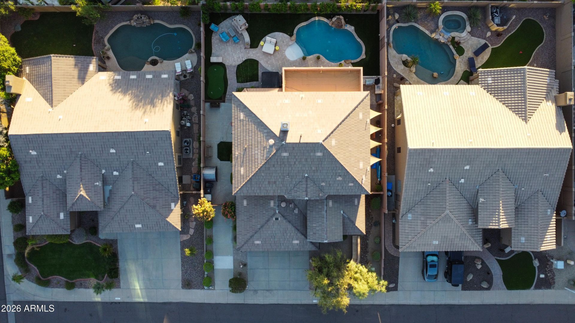 Welcome to this beautifully upgraded home in the sought-after Ahwatukee Foothills Club West. The open floor plan features a remodeled kitchen with custom cabinetry, granite countertops, stainless steel appliances, double ovens, and a spacious island designed for gathering. A stylish wet bar with custom finishes and a built-in wine cooler enhances the homes entertaining appeal, while the custom entertainment center and versatile den or office/theater add both function and elegance. The main level also includes a bedroom and a fully remodeled bath, ideal for guests or flexible living. Upstairs, the expansive primary suite offers multiple walk-in closets and a spa-inspired bath with dual sinks, a Roman tub, and separate shower. A bright loft with built-ins and two additional bedrooms connected by a Jack-and-Jill bath complete the upper level. Step outside to a private backyard retreat featuring mountain views, a Pebble Sheen pool with rock waterfall and gas heater, outdoor shower, full outdoor kitchen, and both covered and open patio spaces with a striking stone fireplace--perfect for year-round Arizona living.