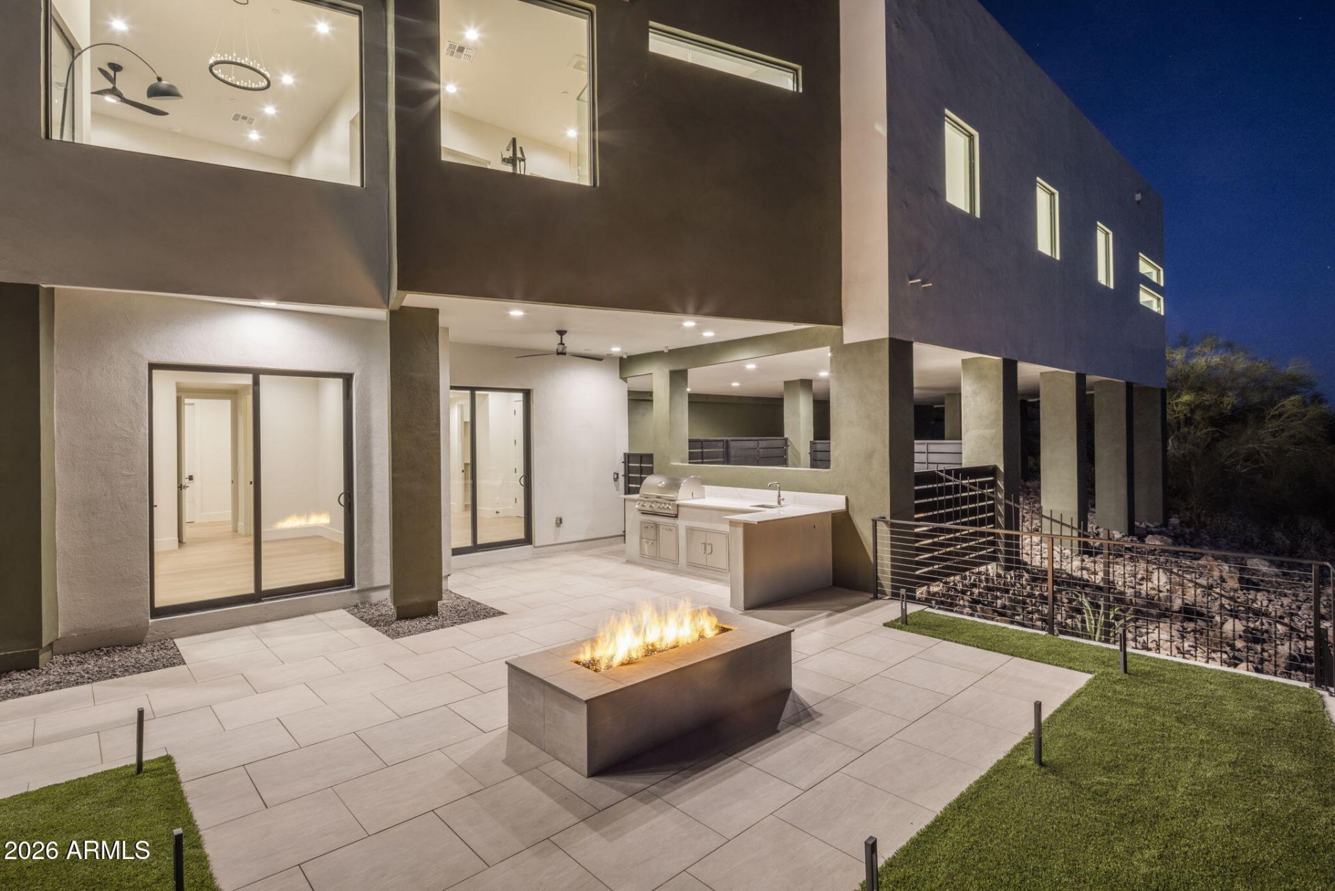 Introducing a 2026 masterpiece by Picasso Homes, nestled within the exclusive gated enclave of Palatial Estates in Fountain Hills. This striking modern-contemporary residence seamlessly blends architectural sophistication with elevated everyday living. Spanning two thoughtfully designed levels. The primary suite is privately situated on the main level, creating a true retreat complete with a serene sitting area and spa-inspired bath. Designed for both grand entertaining and comfortable living, the main floor features a formal dining room, a dedicated office, and an expansive open-concept kitchen outfitted with premium finishes and seamless flow into the living spaces, powder room, spacious laundry and key drop. Downstairs: 3 spacious bedrooms, each w/its own ensuite bath along with an an additional powder, a theatre room and versatile flex space with a built-in bar, refrigerator, and sink provide the perfect setting for hosting or relaxing. Be captivated by the sunsets from the walk out patio. Step outside to your own resort-style backyard, where a sparkling pool and spa, built-in BBQ, and multiple lounging areas invite year-round enjoyment under Arizona skies--all framed by stunning views. A 4-car garage completes the home, offering ample space for collectors and convenience alike. Rare opportunity to own a brand-new, design-forward luxury residence in one of the areas most known gated communities.