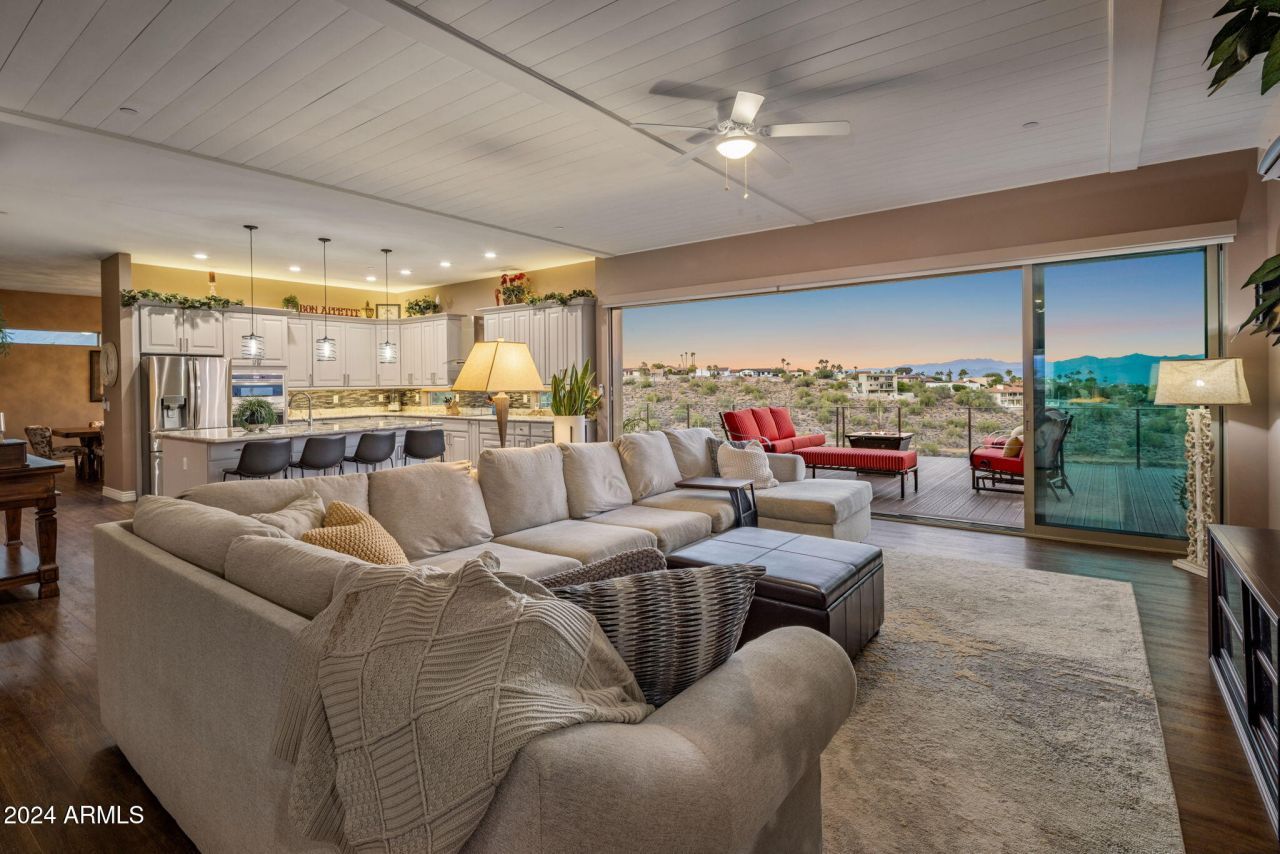 NEW POOL, NEW PRICE! This is the tri-fecta: An elegant 2022-built home, big mountain views, a 1300 guest residence AND a 10-car garage! On the main level, massive views of Four Peaks Mtn and 3 mountain ranges from the great room, bar & island kitchen, with 20 of glass sliders out to a 18x70 deck perfect for entertaining. A crowd-size dining room features storage for all your treasures. 3 suited bedrooms plus a den. Primary suite offers views, spa like bath and large closet. A 2-car garage upstairs, but downstairs a pull-through 8-car garage, shop and 1300 casita with living room & kitchen. Exceptionally built with high-efficiency foam insulation, solar power & mini splits allowing each room to be individually controlled. Casita Furniture included. NO HOA