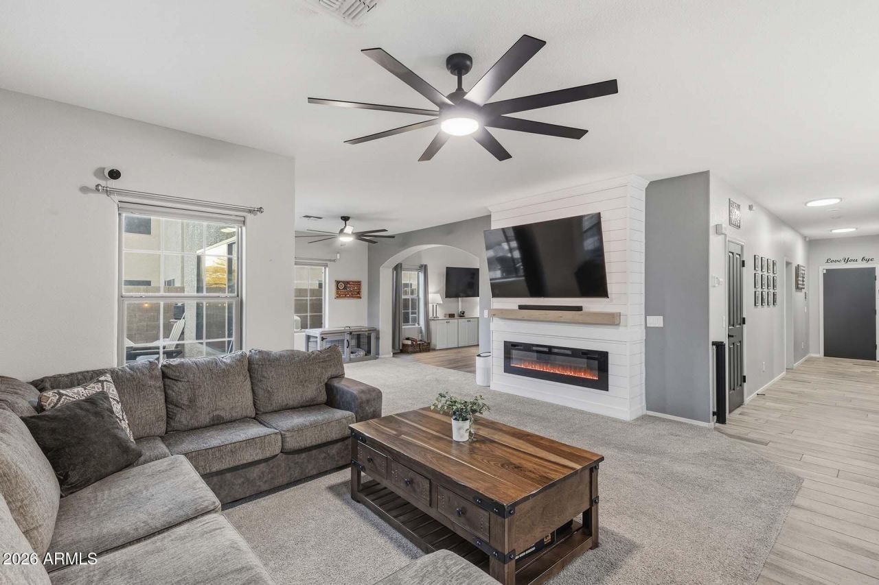Welcome to this beautifully maintained 6-bedroom, 3-bathroom home in the desirable Legacy Parc community in Surprise, offering nearly 3,000 sq ft of living space with north/south exposure, great curb appeal, ample driveway parking, and fully OWNED solar for energy efficiency.Inside, youll find a spacious great room with vaulted ceilings, a striking staircase, and views of the backyard pool. The inviting living area features a cozy electric fireplace with shiplap, while the open-concept kitchen is perfect for entertaining with an oversized island, black stainless-steel appliances, abundant cabinetry, and a custom-built pantry designed for maximum storage and organization. The laundry room has also been upgraded with additional cabinets and a built-in pet feeding station. The first floor includes a bedroom and a full bathroom with a walk-in shower remodeled in 2025, ideal for guests or a home office.Upstairs, the primary suite offers a spa-like bathroom with a Japanese soaking tub, separate shower, dual sinks, and a large walk-in closet.Step outside to a backyard oasis featuring a sparkling pool with safety fence, lush low-maintenance turf, and plenty of room to relax or entertain. Additional highlights include a newer A/C system and a 3-car garage, with the two-car portion separated and converted into a workshop featuring additional electrical, a utility sink, extensive cabinetry, and a 220V outlet for EV charging or power tools.Legacy Parc residents enjoy parks, playgrounds, and basketball courts, making this home the perfect blend of space, functionality, and lifestyle.