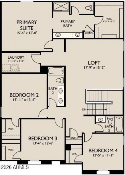 This beautifully designed two story Daisy plan offers 5 bedrooms, 4.5 baths, 3,020 sq ft, and a 3 car garage. The open great room and upstairs loft provide flexible living space. The gourmet gas kitchen showcases the Harmony Collection upgrade with 42 white cabinets, quartz countertops, white backsplash, and wood look tile throughout main living areas. The great room opens through a 4 panel slider to a large covered patio, creating a seamless indoor outdoor space ideal for entertaining. Elevated farmhouse exterior with paver driveway extending to the entry. Includes washer, dryer, fridge, blinds, soft water loop, and EV ready, making it turnkey and ready for an easy, stress free move!