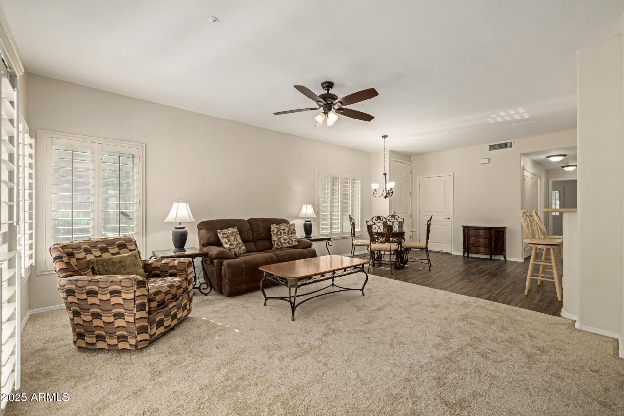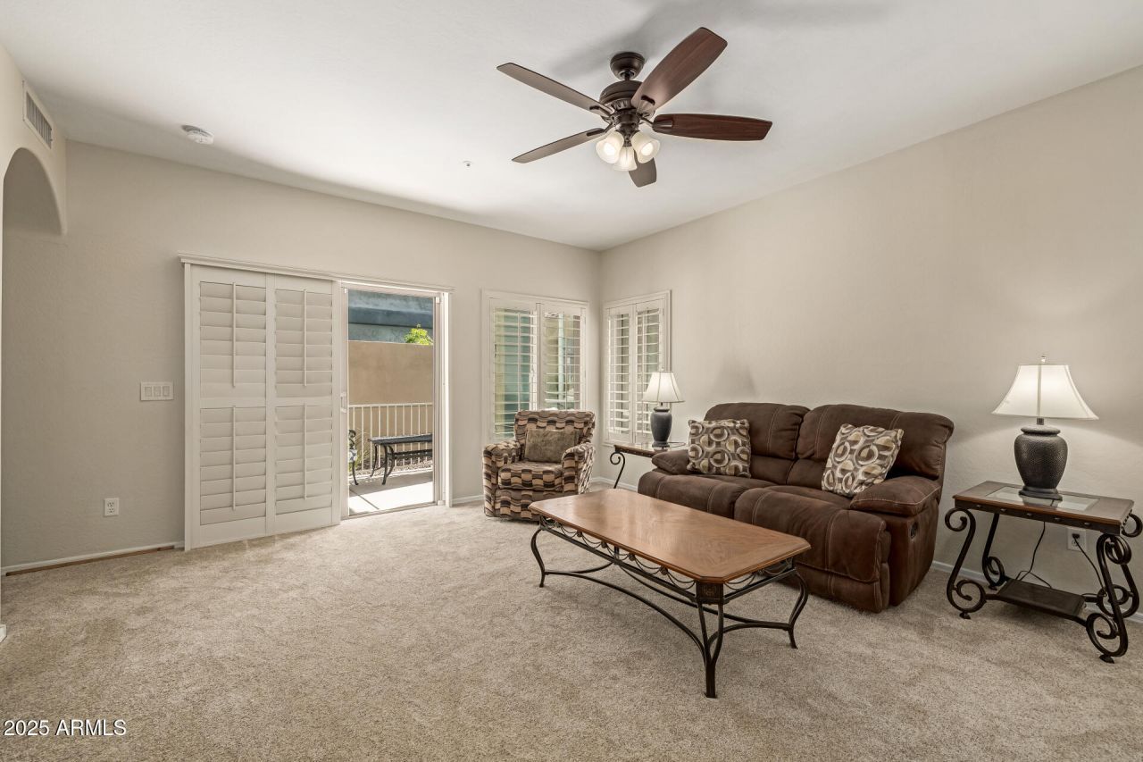 With a prime address, this well maintained ground floor 2 bed/ 2 bath condo in the coveted Town Center Crossing community is available for purchase. Step inside to a bright, open-concept living space featuring classic plantation shutters, brand new plush carpeting and fresh neutral paint throughout. The kitchen with tray ceiling comes with ample wood cabinetry, walk in pantry, recessed lighting and a practical pass-through with a breakfast bar for casual dining. The primary bedroom includes a private bathroom with dual sinks, separate linen closet and a walk-in closet. The covered patio offers a nice shaded extension of your living space. The gated Community boasts a refreshing pool, well-maintained common areas, workout room and close proximity to beautiful down town Fountain Hills.