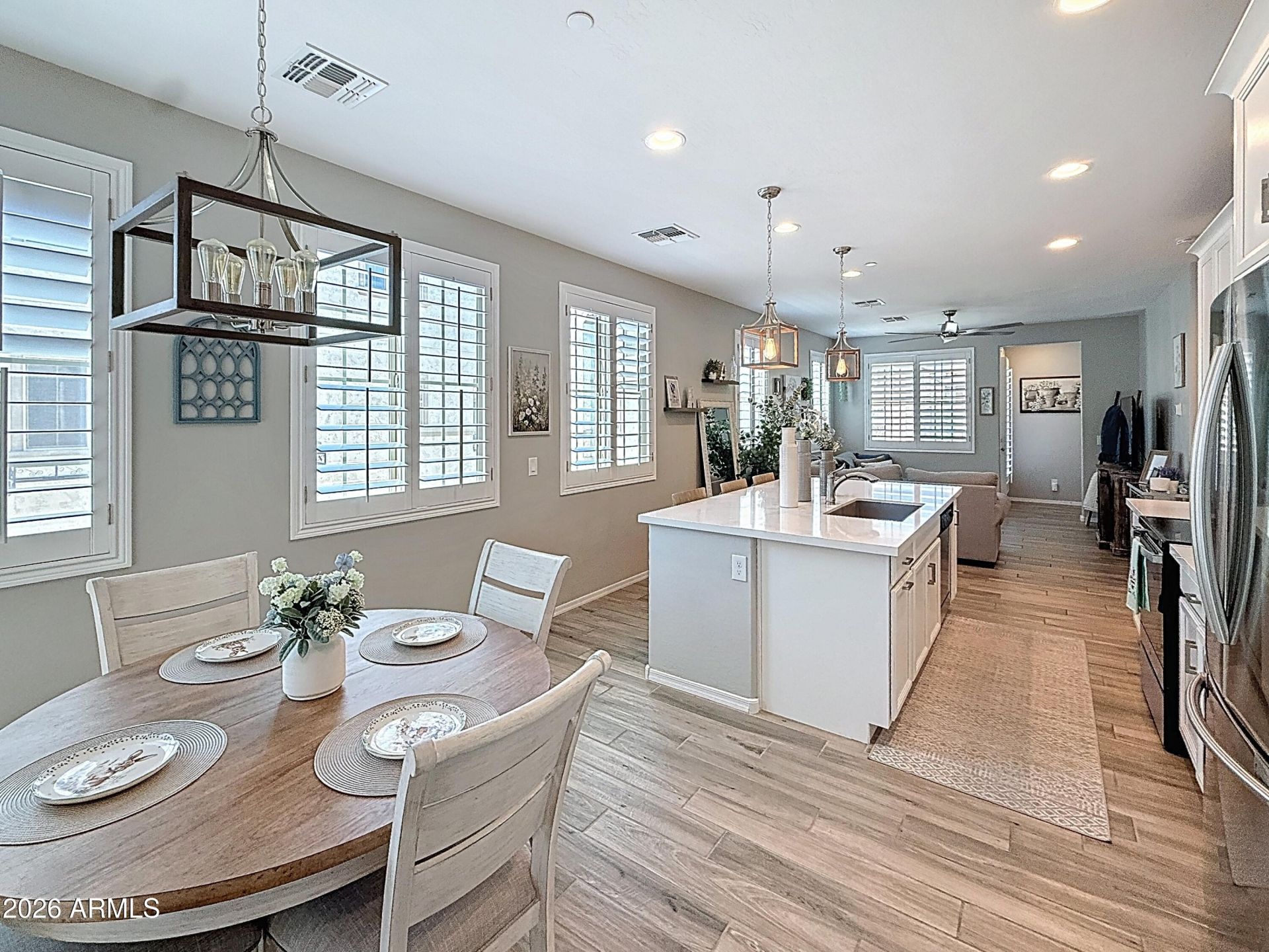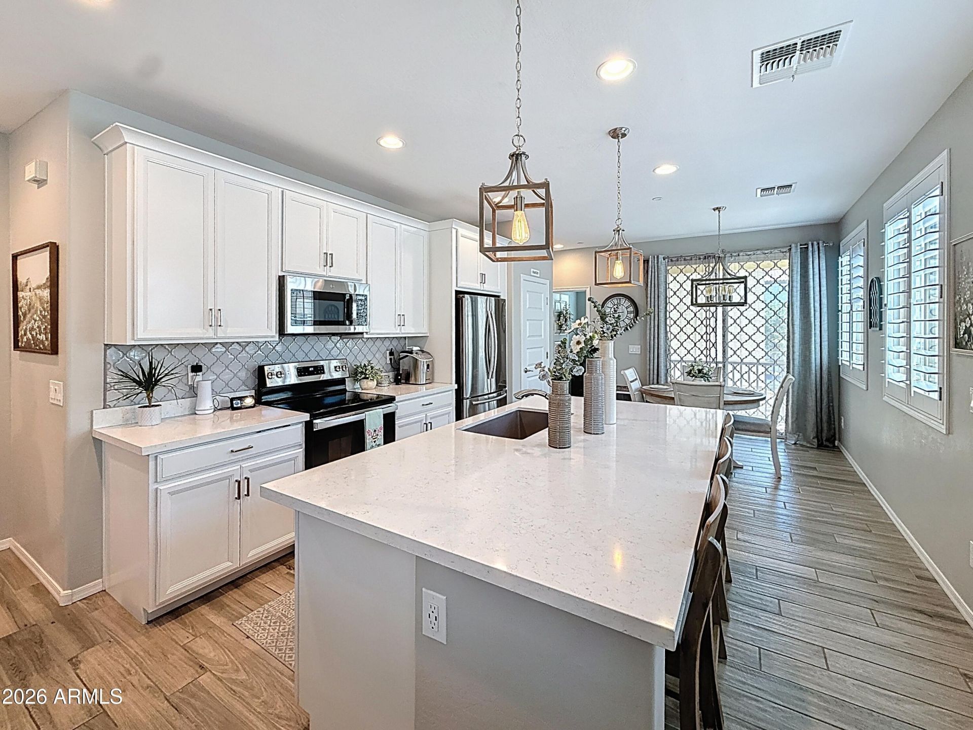 Welcome home to this stunning and elegant 2-bedroom townhome nestled in the heart of Gilbert. Thoughtfully designed with both comfort and style in mind, this beautifully maintained residence offers a perfect blend of modern sophistication and inviting warmth. An open-concept living space filled with natural light, sleek finishes, and a seamless flow ideal for both relaxing and entertaining. The spacious kitchen boasts quartz countertops, stainless steel appliances, ample cabinetry, and a spacious island perfect for casual dining or hosting guests.The primary suite serves as a private retreat, complete with an en-suite bathroom, dual vanities, and a generous oversized closet. The second bedroom is split from the primary and has endless possibilities. This wont last long.