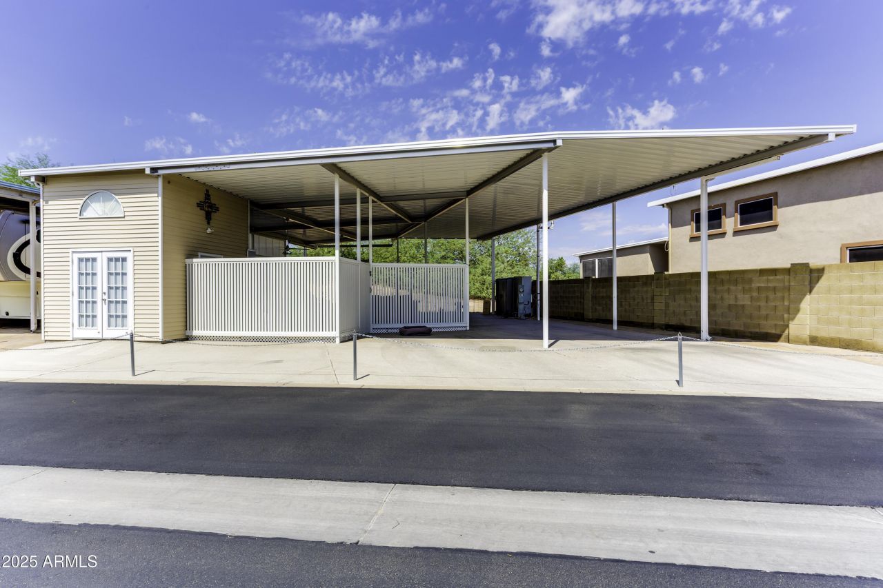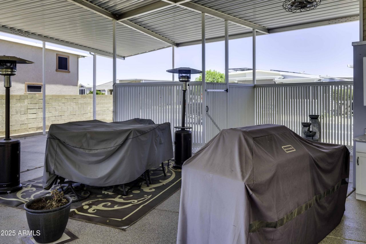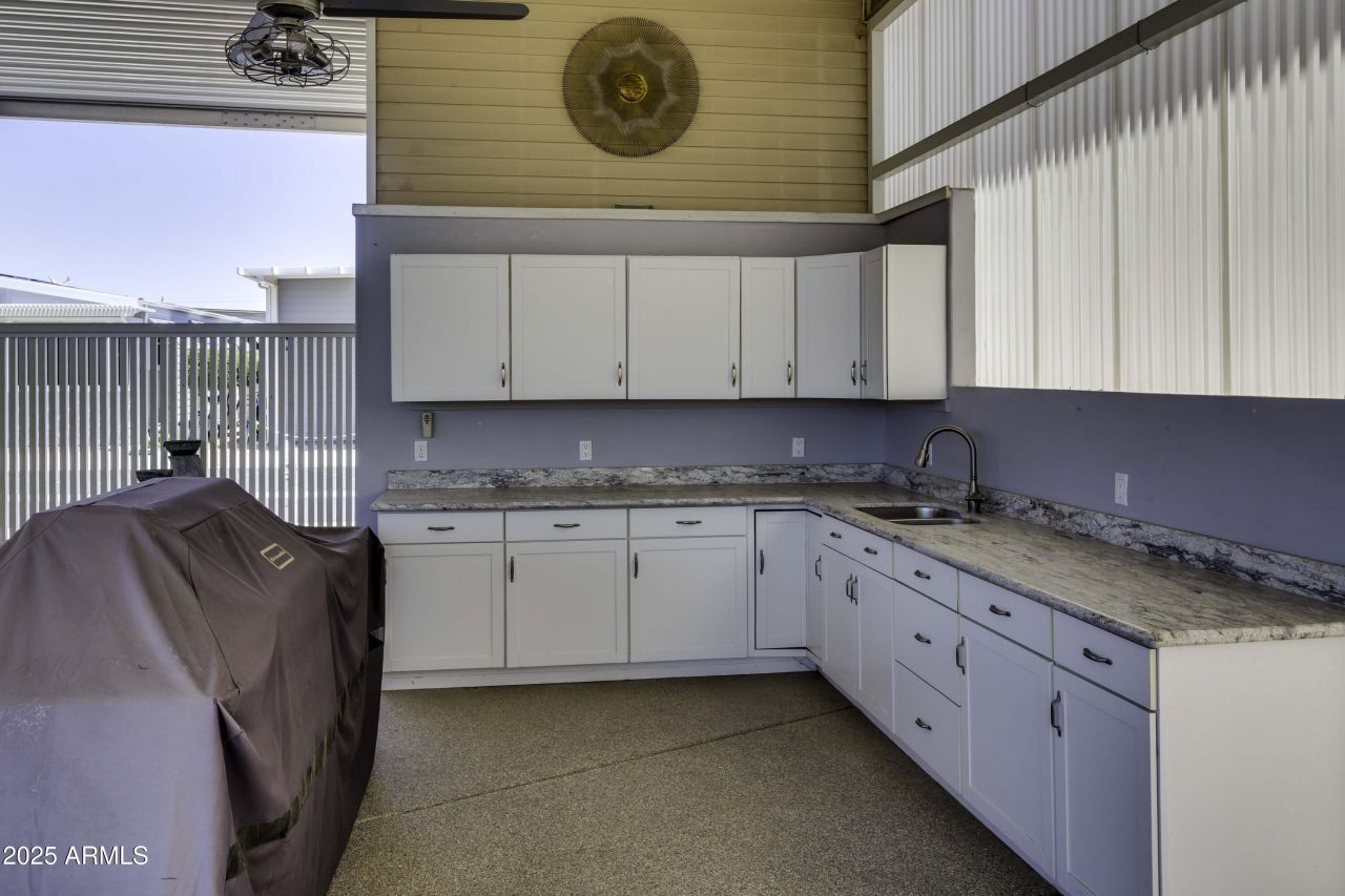 Just picture gorgeous sunsets, White Tank mountains, a lush golf course and that is what describes your new home in Happy Trails. Enjoy upgraded patio furniture while cooking steaks on the amazing grill in the spectacular outdoor kitchen or just relax while watching the beautiful sunsets. An awning completely covers the entire 3390 sq ft lot - one of the largest in Happy Trals-privacy screening on the south side and a brick wall on the north side so you can enjoy a private entertainment space. The Casita has a toilet, shower w/d, frig and upstairs storage and has that designer look. The high quality patio furniture conveys and the 2018 Club Car with lithium batteries is negotiable.