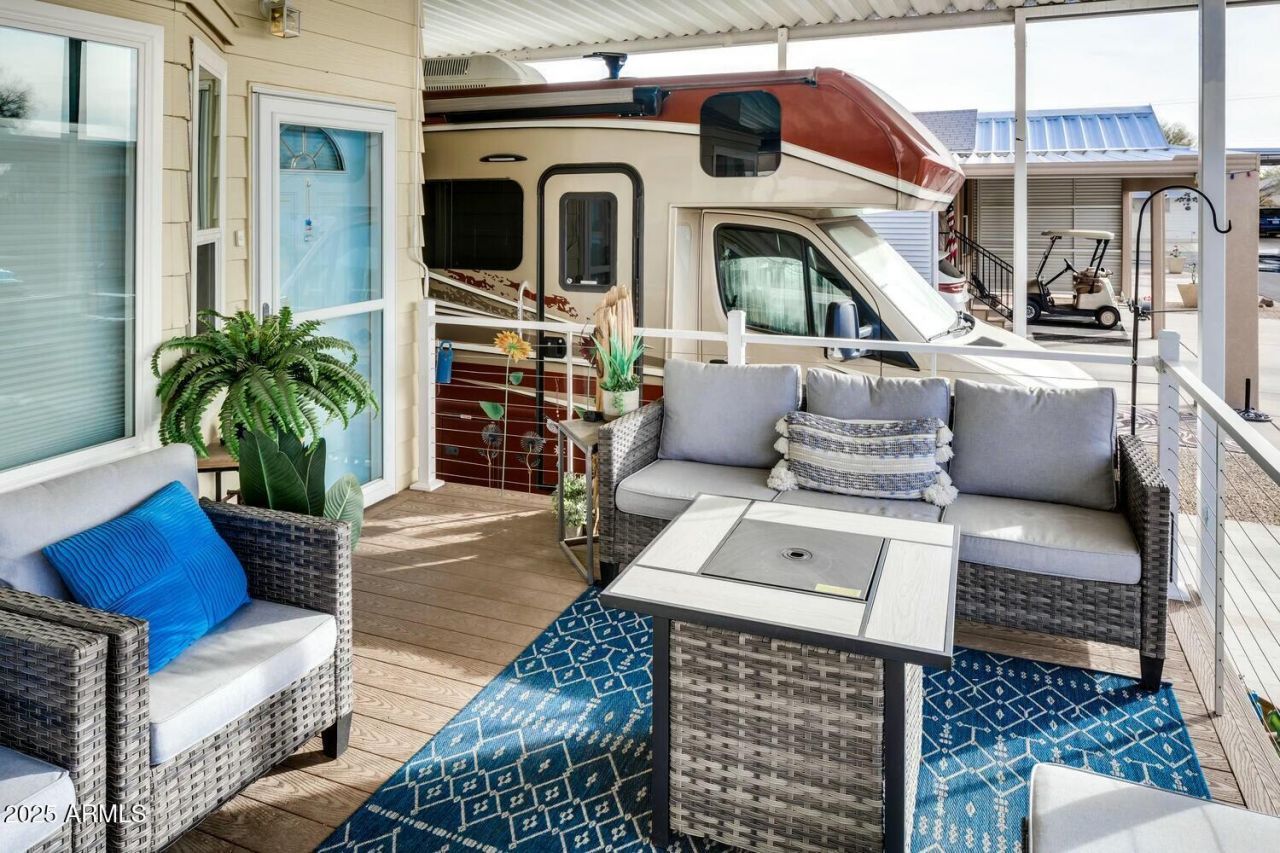 Check out this gorgeous FURNISHED AZ home, situated on a nice lot with desert landscaping. This stick-built retreat offers both comfort and convenience, making it perfect for year-round or seasonal living. The large front porch welcomes you into a remodeled interior featuring a gourmet kitchen and a spacious living area. Kitchen features include Quartz countertops and stainless appliance. The main bedroom has a large closet with built-in desk. Large bathroom w/walk in shower. Upgrades also include Water filtration system, 1 year new AC mini splits and newer water heater too! The home is complete with a covered RV pad that can accommodate most size RVs. This home helps you live the Happy Trails lifestyle at its best!