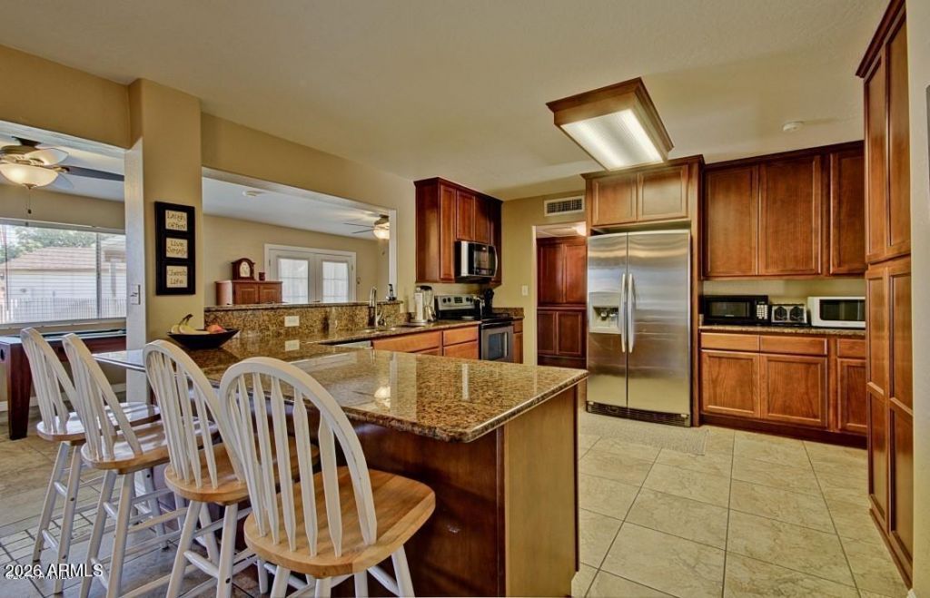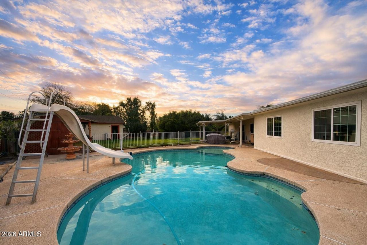 Very Motivated Seller! Incredible opportunity on a unique oversized lot with flood irrigation and NO HOA! This custom Mesa home features 2 primary suites plus a fully equipped guest house-ideal for multigenerational living or rental potential. The main home offers 4 bedrooms with split dual primary layouts, formal living and dining, a spacious family room off the remodeled kitchen, and a versatile bonus room for office or game space. Updated cabinetry, granite countertops, and an open peninsula make entertaining easy. Detached 2-car garage with alley access is perfect for a workshop, hobbies, or extra storage. Come tour your next home today!