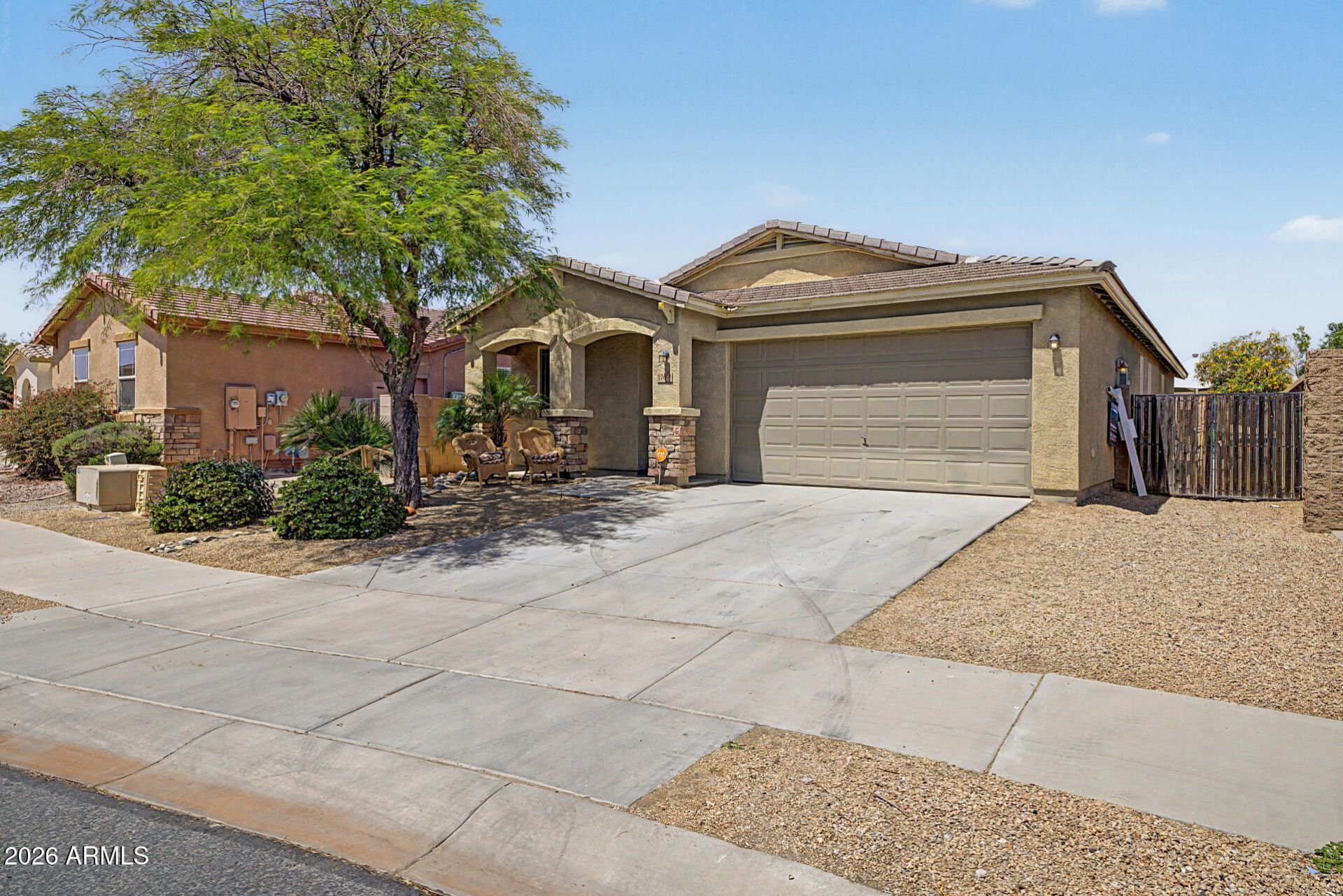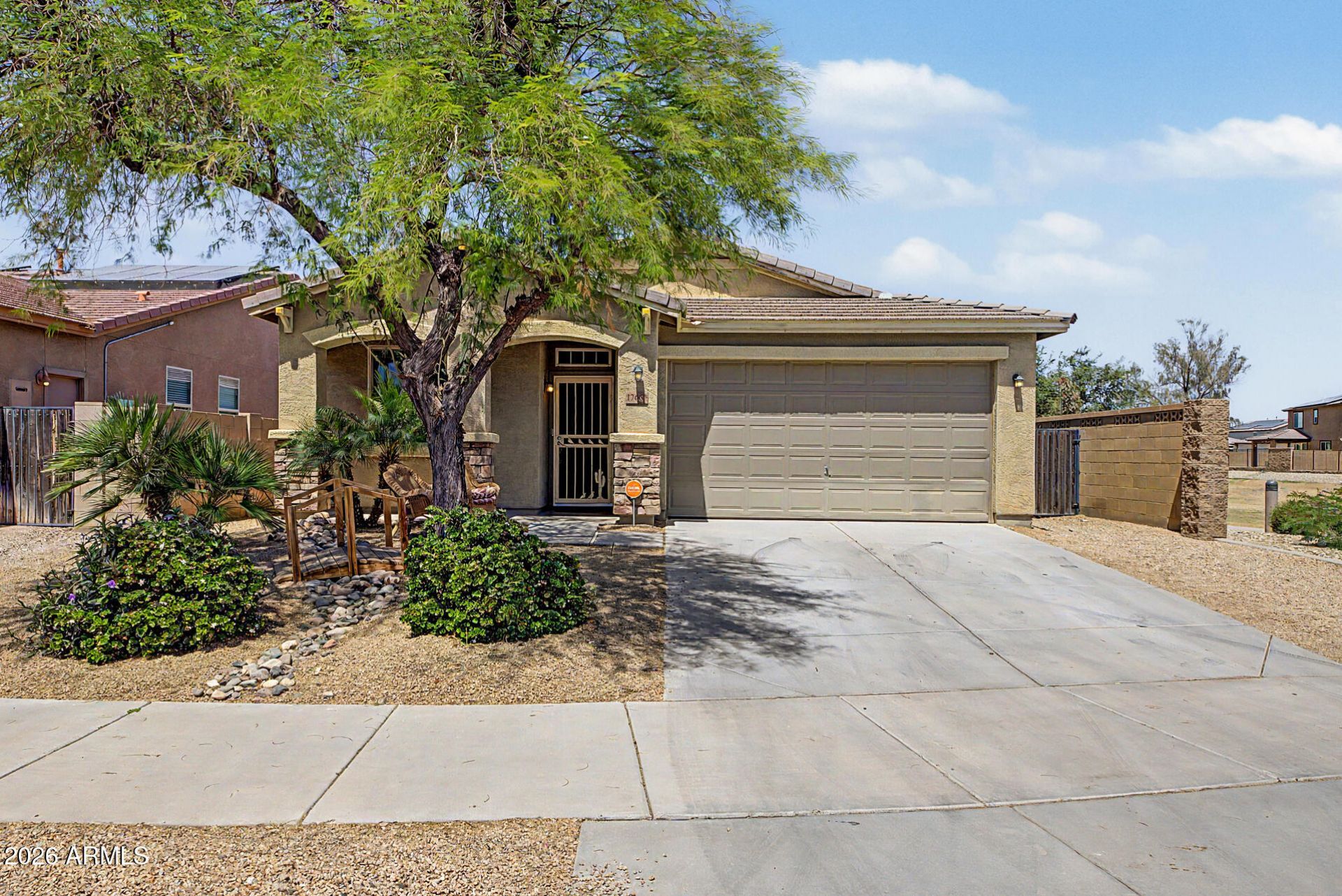 Beautifully situated on a premium corner lot, this home offers added privacy with a single-story property on the left and a greenbelt on the right. Enjoy serene outdoor living from the back patio overlooking a view fence and lush park setting. Inside, youll find a bright and open layout featuring picture windows that bring in abundant natural light. The kitchen is well-appointed with stainless steel appliances, upgraded granite countertops, attractive cabinetry, a breakfast bar, and a pantry--perfect for both everyday living and entertaining. The home features ceramic tile flooring in the main living areas, along with recently updated laminate flooring (installed 4/2/2026) in the bedrooms and hallway. The desirable split floor plan offers privacy, with the primary suite and one secondary bedroom on one side of the home, and two additional bedrooms on the opposite side connected by a convenient Jack & Jill bathroom. The primary bathroom includes dual access for added functionality. Ideally located with easy access to Loop 303 and I-10, and close to community amenities including a pool, spa, parks, basketball courts, and volleyball. Buyer to assume solar lease with a monthly payment of $145.81. Updated Shower in master