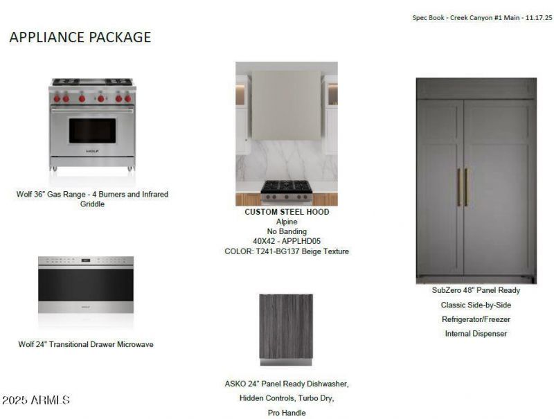 Luxury full-spec home to be built with a 2-bed, 1-bath guest house. Double iron/glass entry leads to 4 bedrooms plus an office/den and 3.5 baths. Features include 12 ft ceilings, 8 ft doors, 90/10 drywall finish, spray foam insulation, and a 47 ft RV garage plus 2-car garage. The chefs kitchen offers a large island, Wolf/Sub-Zero appliances including a 48 gas range and 48 built-in Sub-Zero refrigerator with custom panel front, and Quartzite waterfall countertop. All bedrooms have walk-in closets. Primary suite features a spacious shower, stand-alone tub, double sinks, and custom closet built-ins. Exterior includes paved road, post-tension foundation, paver driveway, walkway, and block fencing with 12 ft RV and 4 ft gates. No HOA. Photos are of a completed model; images for info only.
