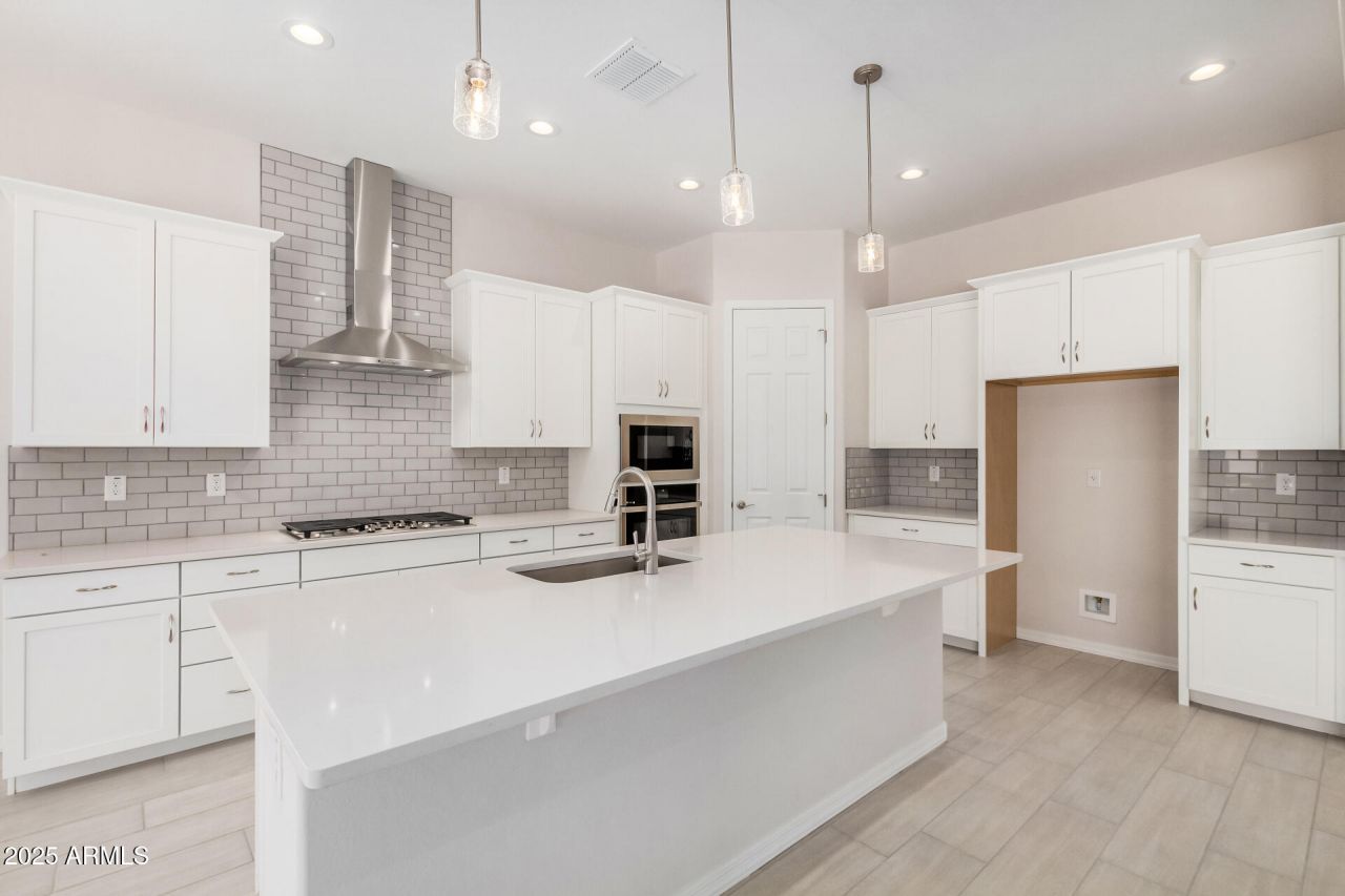 8760 sqft lot - Optional Guest Suite - Gourmet kitchen, quartz countertops, full tile backsplash, white cabinets, pendant lights at island, stainless steel appliances w/pyramid hood & gas cooktop - Multi-slide doors at great room - Walk-in shower at primary bath - Pre-plumb locations at laundry room, soft water loop, gas to patio - 9 x 35 tile floors throughout except for carpet in bedrooms - Satin nickel fixtures throughout - Ceiling fan pre-wires at bedrooms, patio and great room - 10-foot ceilings - Two-tone paint - Garage service door - Cabinets & wet bar sink at guest living room w/ beverage center & rough-in for microwave.