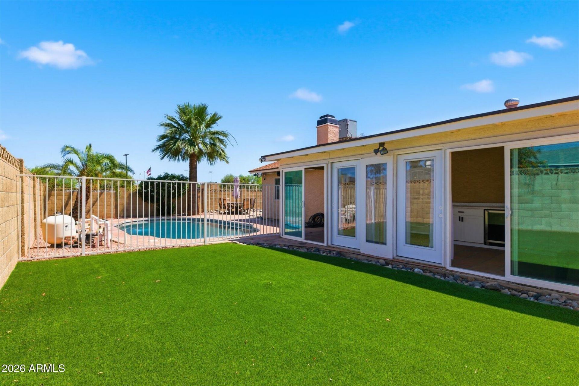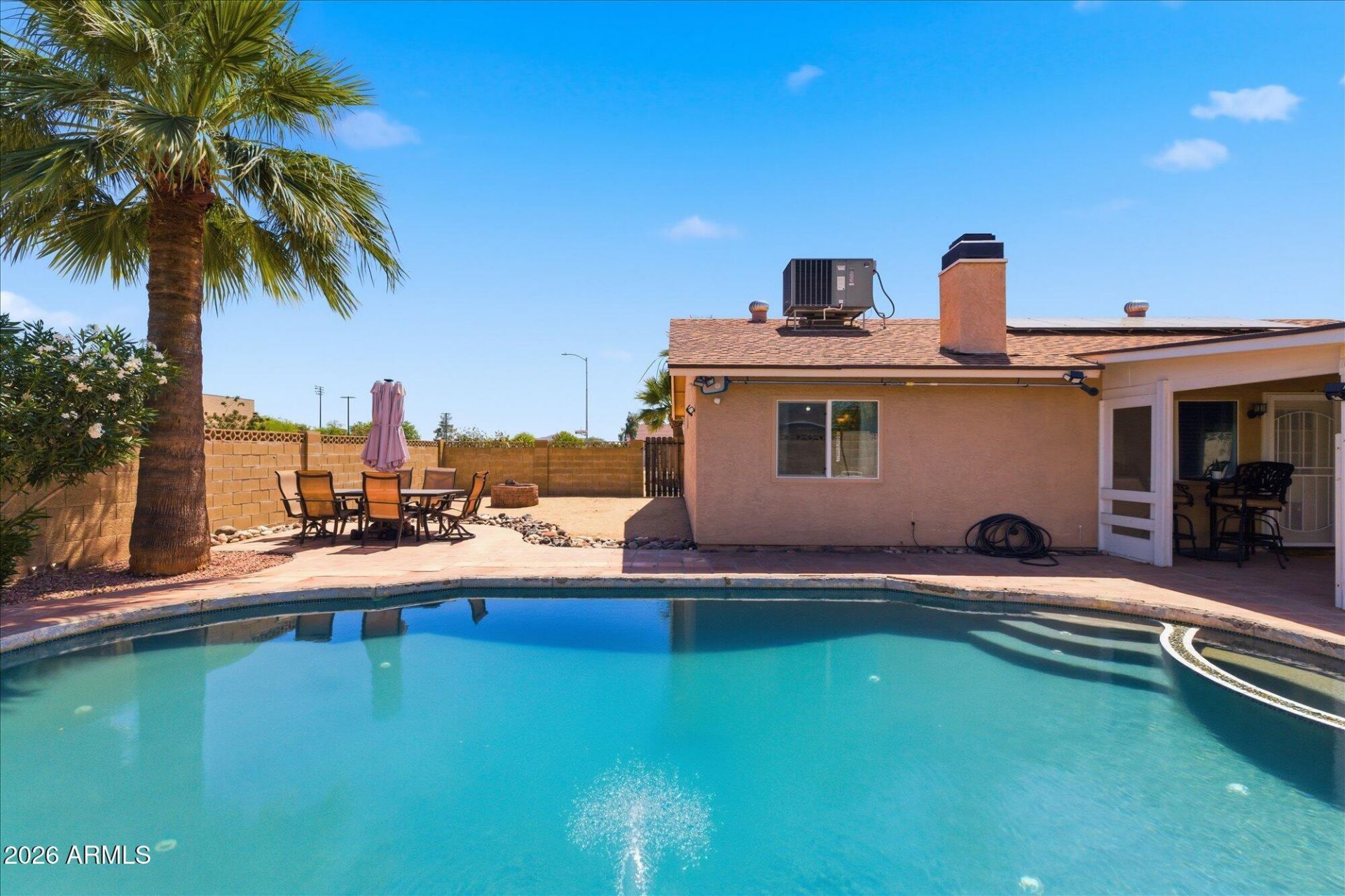 Move-in ready and beautifully updated, this 3 bed, 2 bath single-level home offers 1,400 sq. ft. of open, light-filled living with vaulted ceilings and tile flooring throughout. Features include OWNED solar and a private pool. The remodeled kitchen boasts granite countertops and stainless steel appliances, while both bathrooms are updated with modern finishes. Enjoy a cozy fireplace, enclosed patio with new windows and doors, and a 2-car garage with epoxy flooring. Situated on a corner lot with no HOA, the backyard is perfect for entertaining with a pool, firepit, and RV parking. Conveniently located near community park, with dog park, playground, pickleball and a community center! Near shopping, dining, and easy access to the 101 and I-17.