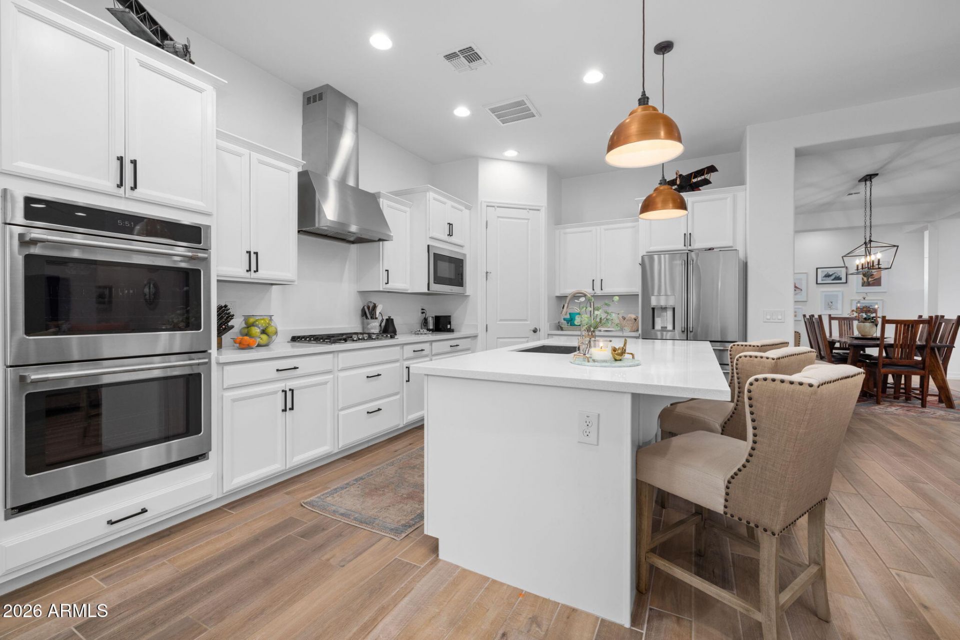 Scenic Desert/Mountain VERRADO Enclave of SIENNA HILLS w Community Park & Swim Club. Uniquely Stylish & Functional Multi-Generational ADELAIDE 5 BDRMS, 4 FULL BATHS includes Attached Private-Entry GST Quarters + Split 3 car garage & Paver Driveway & Entry. Prime Mountain View + Desert Trail Backdrop. Gorgeous AZ Lifestyle Backyard Landscape Design w/Easy Turf Greenery + Covrd & Extnd Travertine Patio +Accent Steppingstones at walkway + Paver Garbage Pad. Exceptional GREAT ROOM LIVING open connection to Formal Dining, Entertainers Kitchen w Breakfast Nook. 42 White staggerd raised-panel Cabs, White Quartz Eat-in Brkfst Bar & Stainless Farm Sink w Pendant Lights, STNLS STL DOUBLE OVENS, COOKTOP, MICROWAVE FRENCH DOOR REFRIG. Quality Chandeliers & New Vanity lights! SWEET HOME AZ!