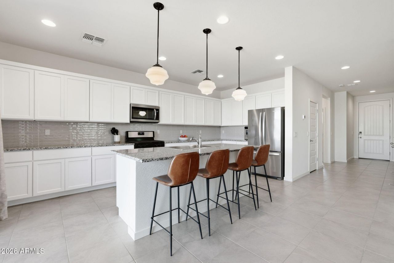 Built in July 2023, this beautifully maintained home offers the feel of new construction without the wait -- plus a fully finished backyard, a rare find for newer builds. The outdoor space features a paver patio, grass area, and built-in seating, perfect for relaxing or entertaining. Inside, the bright open floor plan offers seamless flow between the kitchen, dining, and living areas. The kitchen includes granite countertops, white cabinetry, stainless steel appliances, and a large island with bar seating. The oversized two-car garage with epoxy flooring provides extra storage space. Located in a desirable Queen Creek community with a community pool and a short drive to Frontier Family Park, a resident-only park for the 85142 zip code.