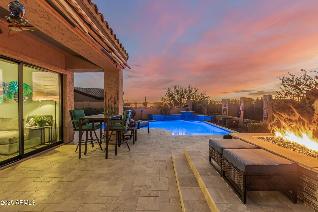 MOTIVATED SELLERSThe search is finally over! This gorgeous 3-bedroom townhome welcomes you with a 2-car garage, stylish pavers, and an inviting front patio. Fall in love with the captivating great room with high ceilings, crown moulding, classic plantation shutters, and durable tile flooring. The stunning kitchen comes with granite counters, abundant wood cabinetry, a mosaic tile backsplash, stainless steel appliances, chic pendant lighting, and an island with a breakfast bar. The primary bedroom features plush carpeting, an ensuite with double sinks, and a walk-in closet. Enjoy enchanting sunsets in the backyard, complete wth a covered patio, a fire pit for starlit evenings, travertine pavers, and a sparkling pool for refreshing dips. Dont miss out on this incredible gem!
