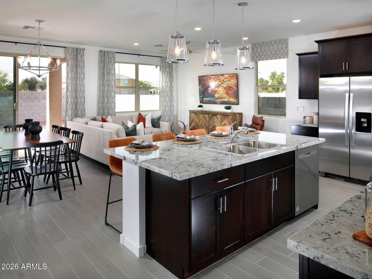 2022-built single-story home on a corner lot in Coyote Ridge, Buckeye, AZ near I-10 and Verrado Way.This 3-bedroom, 2-bath home offers 1,572 sq ft on a 5,951 sq ft lot with high ceilings, tile flooring in main areas, and an open-concept layout. Kitchen includes espresso cabinets with crown molding, granite countertops, pendant lighting, and a large island with breakfast bar seating. Primary suite features dual sinks and a walk-in closet. Exterior includes low-maintenance desert landscaping, paver driveway, 2-car garage, and RV gate for backyard access. Private backyard with covered patio and mountain views. Located near Costco, shopping, dining, and convenient I-10 access for commuting.