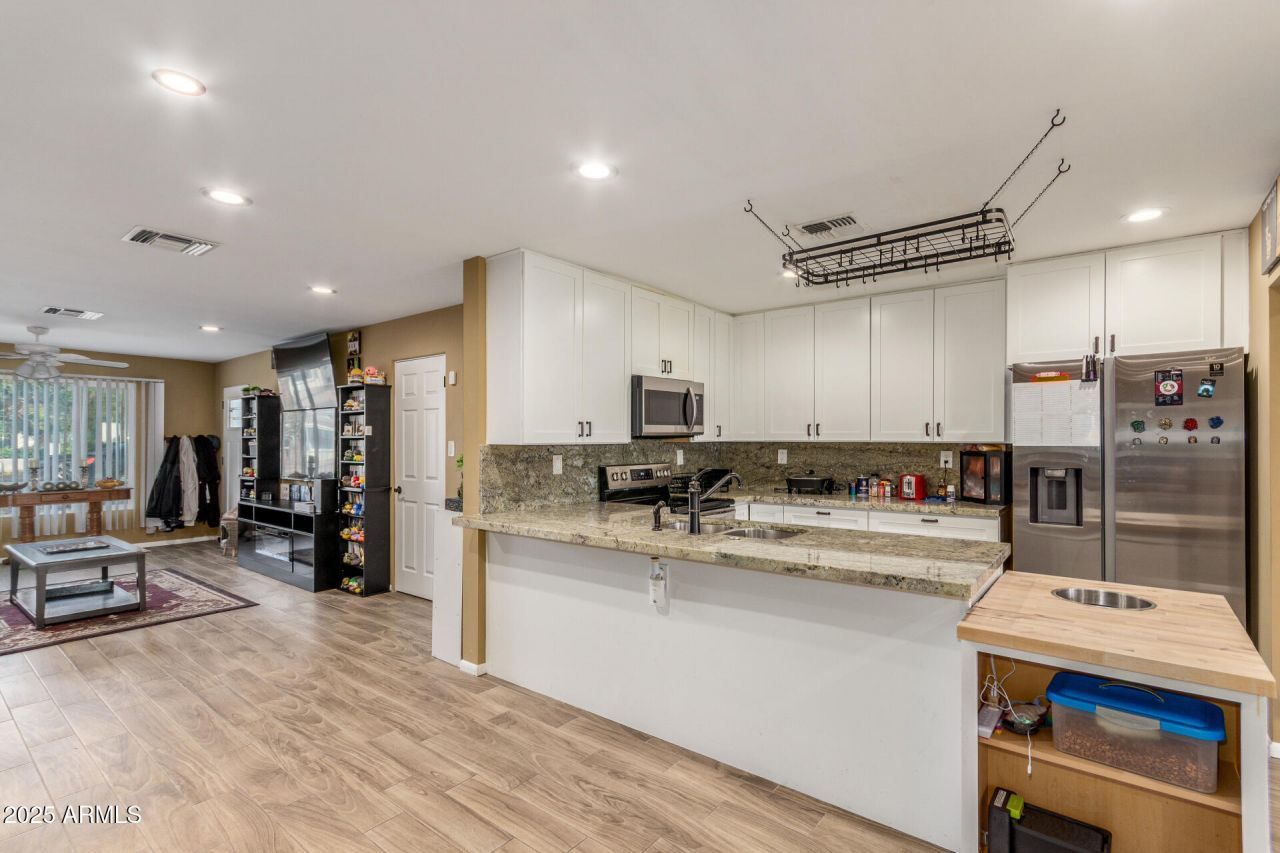 Seize the chance to own this charming 4-bedroom home with no HOA and a brand new ROOF !!! Youre greeted by a serene living room with recessed lighting, and stylish wood-look flooring. Gather loved ones in the dedicated family room, complete with double French doors that lead to the backyard for seamless indoor-outdoor flow. The kitchen features granite counters with a matching backsplash, white shaker cabinets, a hanging pot rack, stainless steel appliances, and a peninsula with a breakfast bar. The primary bedroom boasts an ensuite with dual sinks, and a walk-in closet. Spend enchanting evenings in the lovely backyard, offering a covered patio, direct alley access, well-laid pavers, and a manicured lawn for outdoor activities. Dont miss out on this gem!