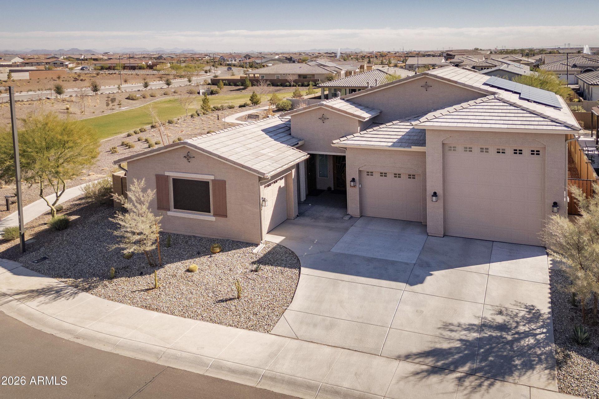Welcome to this beautiful--and more importantly, exceptionally comfortable--lightly used, upgraded home. The main residence features 3 bedrooms and 2 bathrooms, while the attached guest house offers nearly 700 sq. ft. of independent living space, complete with its own kitchen, garage, and laundry. Truly a rare setup that lives like two homes in one.The main house also boasts an RV-plus garage, opening the door to all kinds of possibilities. Car enthusiast? Add a lift in the RV bay. Love to travel? Theres ample room for your RV, vehicles, toys, and even neighborhood electric vehicles (golf carts). In fact, in this community, about half of the RV garages are used for RVs and the other half for all sorts of fun hobbies and storage. This Explorer floor plan is ideal for privacy and flexibility. Enjoy your own space while making family and friends feel oh so comfortable during extended stays in their spacious guest house. Its also a fantastic setup for an adult child (18+) or a parent who wants independence with proximity.The great room will allow everyone to enjoy the goings on where we have set the table for 2 or 14 during game night or dinner entertaining. We spared no expense in upgrading the beautiful flooring with an 12x24 in a Dove Driftwood style. All the bedrooms were upgraded after purchase with 8x48 tile in a plank look natural Timber Ash, beautifully tying the Grayish interior paint which allows for a gray and/or beige decorating style. The kitchen and vanities are finished in a Sonoma Cherry slate with White Knight Granite. Some of the many seller upgrades after sale include 3 Steel Sheild custom security doors, 2 tone paint, pendant lights, 8 ceiling fans, including an extra installed in the owners bath, slider auto shade and antenna in attic has provided good reception for free tv, full list attached hereto. The location allows additional privacy as it backs an approximately 30-foot community landscaped area. Like entertaining? Look at this lovely backyard landscaping, with almost no maintenance. This was our second home 6 months a year, so we wanted easy care; 3 concrete patios & extended main patio, all laid with rebar for stability and coated with cool decking for beauty, artificial turf, custom solar lighting, and 27 pieces of metal art. The front yard was redone in a desert landscape. The enormous garage includes epoxy coating; attached retro cabinetry; ceiling storage racks, full house water filtration and softener too. Check out our utility bills, although we were not here in summer, the fully paid Solar system is a big bonus! Did we mention the smart features? Keyless door lock, apps for HVAC/Heat controls, garage door openers and water controls too? This community is probably about 40% complete, a limited 1500 homes will complete the resort style community. Great news for you, this home purchase has most of the work done, just start enjoying the festivities, another bonus, no construction & landscaping installs to live with daily in the neighborhood. The desirable location is about a quarter mile to the stunning facilities where you can participate as much or as little as you like. The Clubhouse spans over 14,000 sq. ft. and features a state-of-the-art fitness center, multi-use meeting space and stage area, resort-style pool and spa with water features, spacious deck, fire-pits, covered patios and restrooms/shower facilities. The community is gated, has seven acres of lakes, twelve lighted pickleball courts, three lighted bocci courts, a 9-hole putting course with