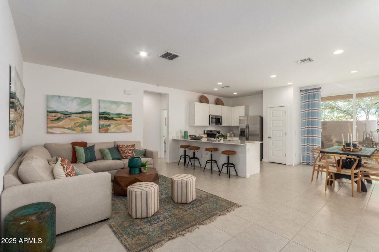 Current Lennar model home in the sought-after Windstone Ranch community of Surprise! A charming courtyard welcomes you into this single-story home featuring an open layout that connects the Great Room, kitchen, and dining nook. The kitchen boasts white cabinetry, quartz countertops, a gas cooktop, and stainless steel appliances. Sliding glass doors open to a covered patio with low-maintenance desert landscaping???ready to customize to your needs. The private owners suite is tucked at the back, with two secondary bedrooms nearby. Neutral beige tile and carpet throughout. Furnishings available on a separate bill of sale.