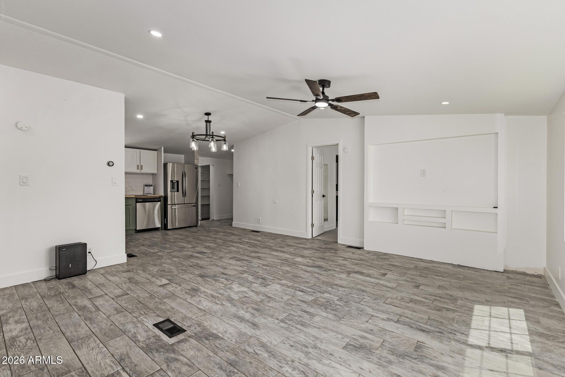 Situated on a 1-acre lot with direct San Tan Mountain views, this Queen Creek property offers a 3 bedroom, 2 bathroom main home with 1,186 sq ft, plus an additional 416 sq ft of flexible living space featuring its own bedroom and bathroom, along with a sink, cabinetry, and refrigerator setup--perfect for guests, a private workspace, or multi-generational living.The home also features an upgraded kitchen, walk-in pantry, and modern interior fixtures and finishes throughout. The acre lot provides room for horses, animals, RVs, and toys, plus an above-ground hot tub and black Conex storage container for extra storage or workshop use. Enjoy wide-open space and stunning San Tan Mountain views while still being close to Queen Creek amenities.