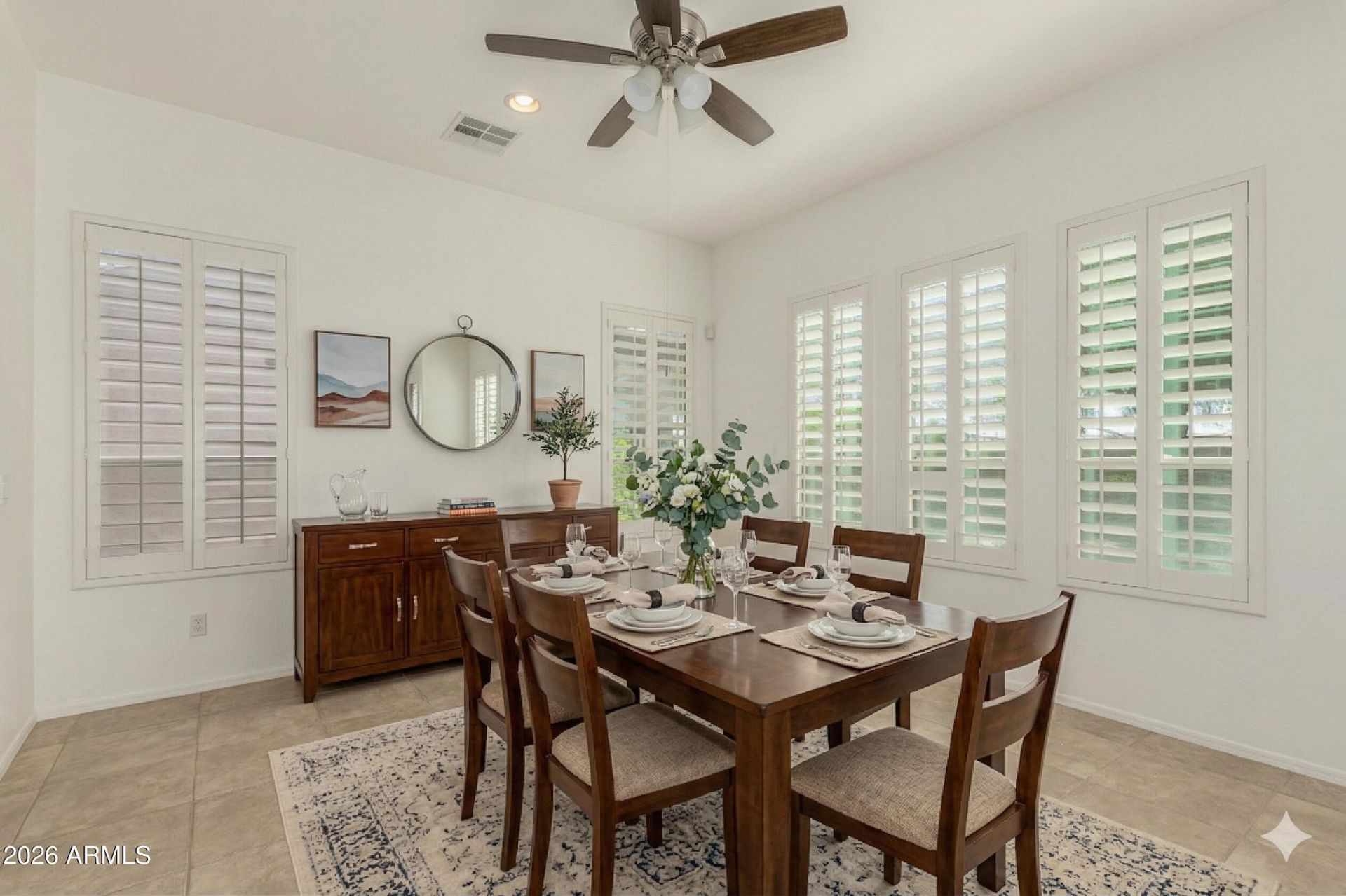 Welcome home! This 2 bedroom, 2 bathrooms, plus a versatile den with an attached Murphy bed & built-in desk, perfect for guests or a home office. With 1,867 sq. ft. of thoughtfully designed living space & 10-foot ceilings, this home feels open, bright, and welcoming.Enjoy plantation shutters throughout, tile flooring in the main living areas, & upgraded Berber carpet in the bedrooms. The spacious kitchen features ample cabinetry, Corian counters, a huge island, canned lighting, and stylish pendant lights.Spacious primary suite offers a serene retreat with a bay window, large walk-in closet, and a spa-like bath. The guest bathroom includes a luxurious walk-in soaking jetted tub.Out back, relax on the covered, paver patio, sharpen your short game on your private putting green, and enjoy added privacy with a block wall at the rear of the yard.The extended garage includes a 3-foot depth extension and a 6-foot-wide golf cart space, offering plenty of room for vehicles and hobbies. Additional features include added gutters for year-round comfort and home protection.Located within the award-winning, gated Trilogy at Vistancia, residents enjoy 5-star resort-style amenities including the 35,000 sq. ft. Kiva Club with indoor and outdoor pools, fitness center, day spa, café, billiards, library, meeting rooms, and a packed calendar of social activities. Sports enthusiasts will love the tennis, pickleball, and bocce ball courts, plus Trilogys beautiful Gary Panks-designed golf course and on-site dining at Vs Taproom.The nearby Mita Club adds even more amenities like a resort pool, tennis courts, café, culinary kitchen, artisan studio, and fitness center. With easy access to the Loop 303, dining, shopping, and entertainment, this is truly Arizona resort living at its finest.Dont miss your chance to own this special home in one of Arizonas most celebrated active adult communities!