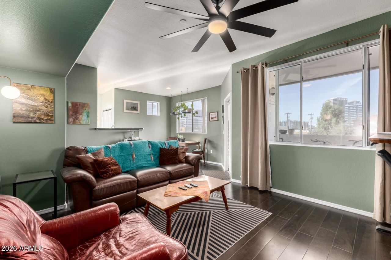 2 bedroom, 2 bath, 1,178 sq ft condo near the heart of downtown Phoenix includes a 1-car carport parking space, features a desirable split floorplan with two master bedrooms, each with an attached bathroom, large walk-in closet, and plenty of privacy. The spacious kitchen offers abundant cabinet and counter space and opens to a breakfast and dining nook, while wood flooring runs throughout the main living areas with carpet in the bedrooms. Youll also love the convenience of interior laundry, hot water heater replaced within the last three years, and A/C unit has been replaced (3/13/2026). Enjoy gorgeous views from your private balcony in this gated community with resort-style amenities including a pool, spa, BBQ area, and fitness center!