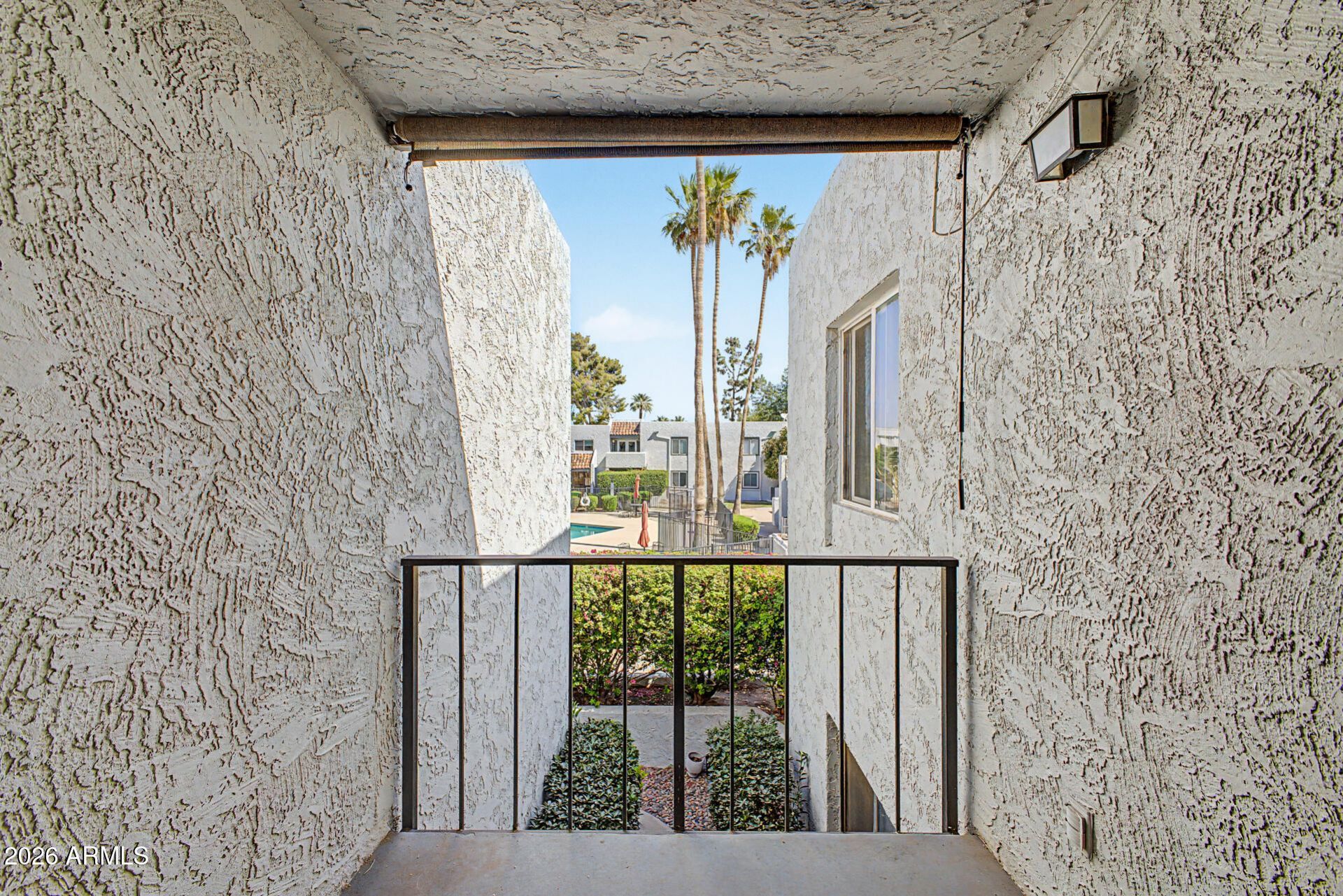 Close to Old Town Scottsdale! Canal nearby to enjoy a walk or bike ride. Near restaurants, highway 101 and 202, hospitals and shops. This charming apartment unit is the one youve been searching for! Discover a serene living room with a soothing palette and wood-look flooring. The eat-in kitchen comes with ample wood cabinets, a tile backsplash, and essential built-in appliances. The bedroom includes double built-in closets and a walk-in closet for an organized wardrobe. Private balcony with pool view. The Community has green spaces and a refreshing pool for cooling down on hot days. Dont miss your chance to own this charming property! HOA covers