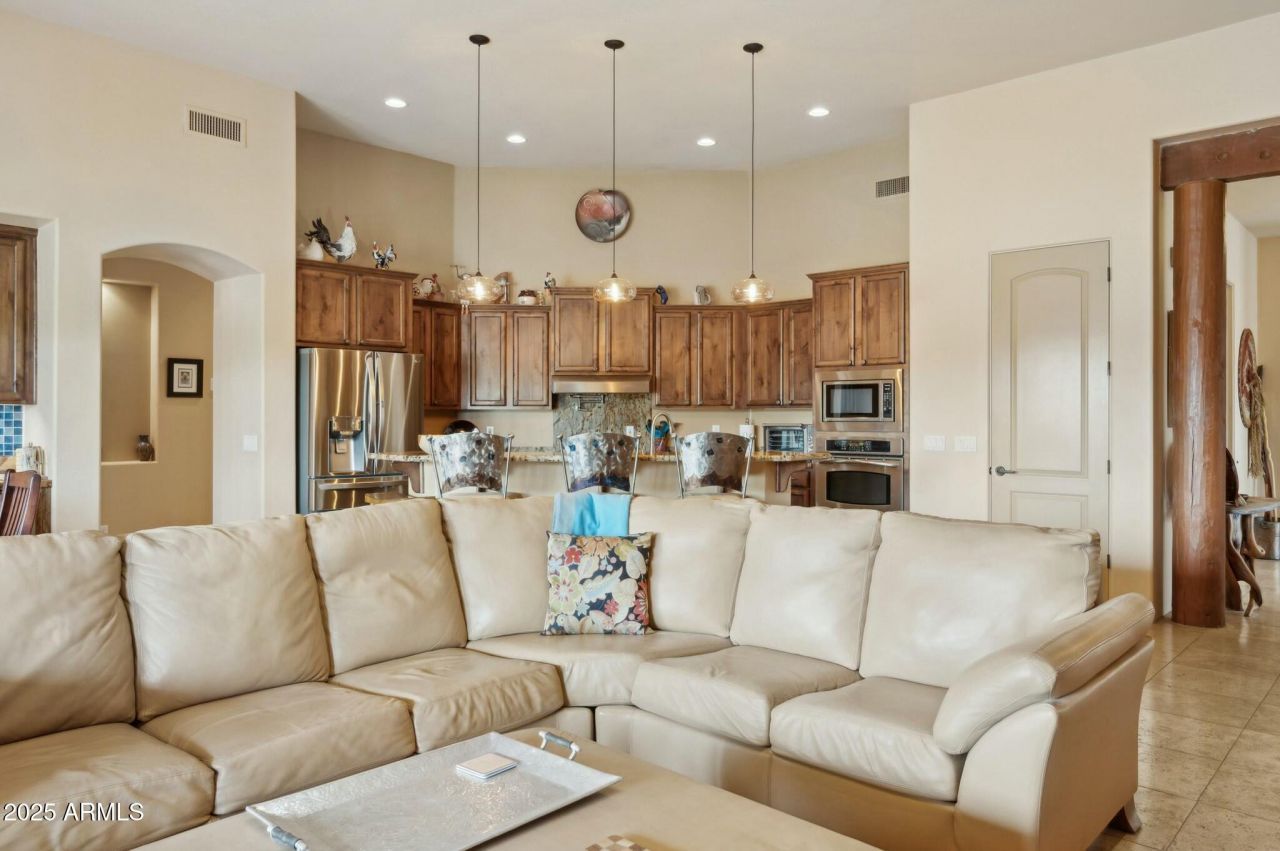 Desert retreat with panoramic mountain views and stunning sunsets on over an acre! This 4 bed, 4.5 bath custom home sits in a private setting on a secluded cul-de-sac facing open space with a view of Daisy Mountain. Enjoy sunsets from your front courtyard or extended covered patio perfect for relaxing or entertaining. The split floor plan allows for privacy, and blends functionality and space with each bedroom being en-suite with walk-in closets, and a dedicated home office. Inside youll find a soaring great room with a stone fireplace, chefs kitchen with stainless steel appliances, pantry, breakfast bar, and a stylish dry bar complete with both wine and beverage fridges. A living room with wood beam accents offers more room to gather, or bring your pool table. The primary suite features private patio access, a spa-like bath with jetted tub, and a generous walk-in closet. The oversized 3-car garage includes a cooled/heated workshop which has endless other possibilities for an exercise room, art studio, business office, or great space for that prized car. **Extras include a gazebo, fire pit, RV gate and hook-up with room for your RV, boat or toys. All in a quiet neighborhood minutes to Lake Pleasant, hiking and horseback trails, shopping and freeway access.**