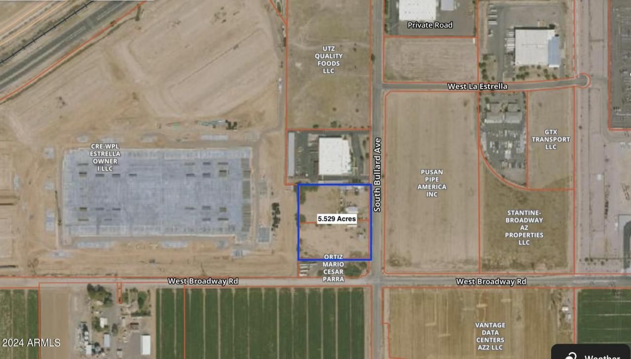 Dont miss out on the incredible opportunity to own approximately 5.5 acres in the industrial complex at Bullard and Broadway Roads in Goodyear. This prime location is surrounded by data centers, industrial warehouses, and experiencing explosive growth. Situated just south of the Goodyear airport and rail line, this property offers a huge investment potential. Take advantage of this rare chance to own a piece of land in a rapidly developing area with endless possibilities for development and growth. Offering is 2 properties and includes 4204 S Bullard.Property is connected to City water and sewer is available at the site.Listing agent is related to seller
