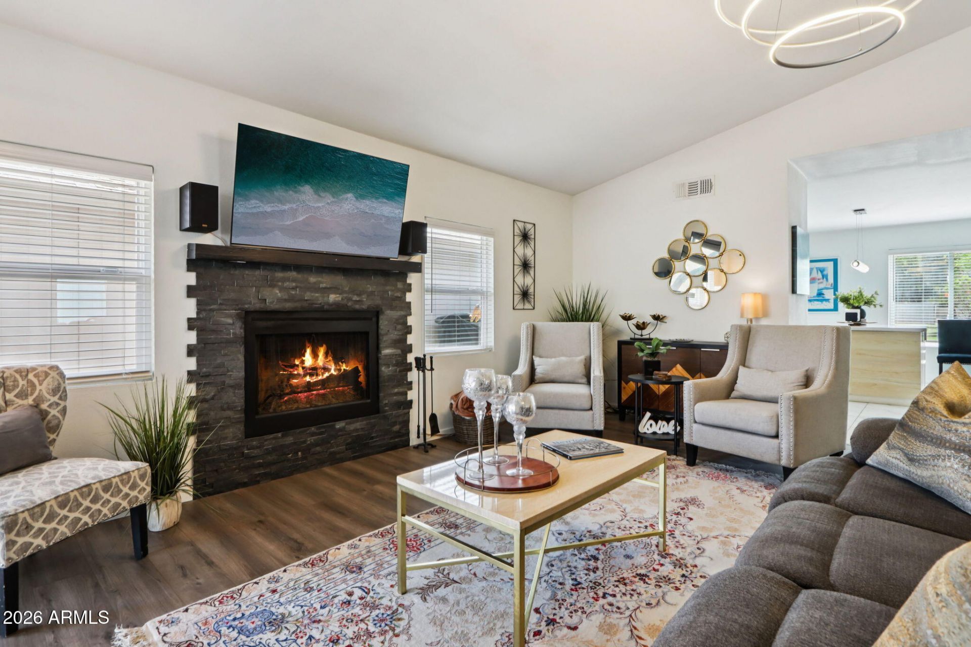 Updated and adorable single level home nestled in a neighborhood with community amenities that include a pool, tennis courts and walking paths with a large park right outside your front door. Inside features a spacious great room with vaulted ceilings, a stone surround fireplace and tile and wood look laminate flooring throughout. The kitchen is updated with quartz countertops, tiled backsplash, induction cooktop, stainless-steel appliances, including a wall oven and a built-in coffee maker! Both bathrooms have been remodeled with clean, modern finishes. Well maintained with the major updates already completed, making this an easy move.Convenient location with quick access to Loop 101 while still offering an established, comfortable setting.