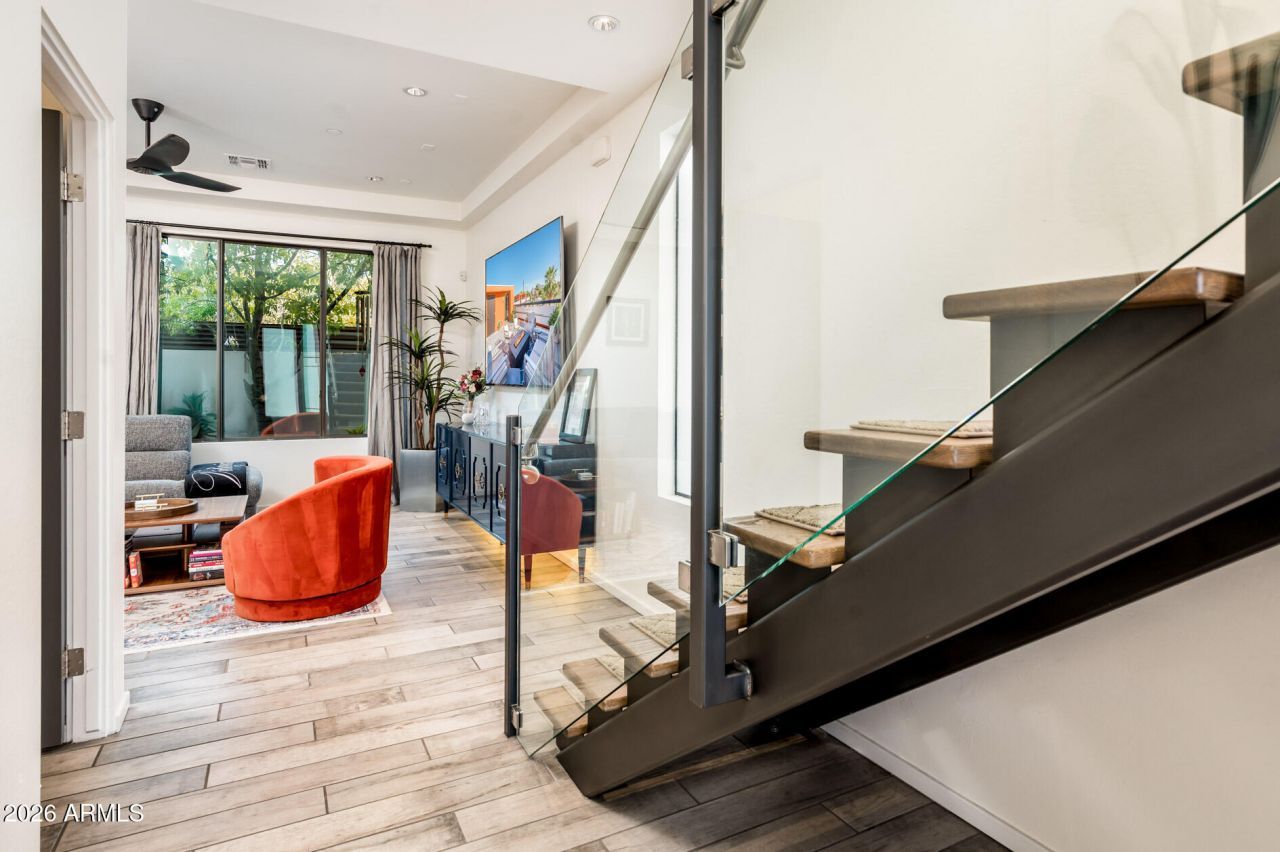 Located in a highly sought-after gated community in the Biltmore/Camelback corridor, this exceptional end-unit residence offers elevated living with gorgeous rooftop views of Downtown Phoenix, Camelback Mountain, and Papago Park. Designed with both functionality and comfort in mind, the home features stylish interiors, modern systems, and seamless indoor-outdoor living.The main living area is open and inviting, ideal for both everyday living and entertaining. The kitchen is equipped with stainless steel appliances, ample storage, and convenient direct access from the private two-car garage.Upstairs, the primary suite provides a private retreat with generous space, excellent natural light, and thoughtful design. Two additional rooms offer flexibility for guest bedrooms, a home offic or additional living space.Smart-home integration enhances everyday convenience with dual-zone HVAC, Wi-Fi-enabled thermostats, and smart lighting controls throughout. Outdoor living is a true highlight. A private rooftop deck with fire table creates the perfect setting for entertaining or relaxing while taking in iconic Arizona views. The private backyard with pergola offers additional space to unwind. As an end unit, the property enjoys enhanced privacy and abundant natural light.Ideally located just steps from Los Olivos Park and within minutes of Biltmore Fashion Park, top dining, grocery options, SR-51, and Sky Harbor Airport, this home combines convenience with a premier lifestyle location.A rare opportunity to own a move-in-ready home in one of Phoenixs most desirable corridors.