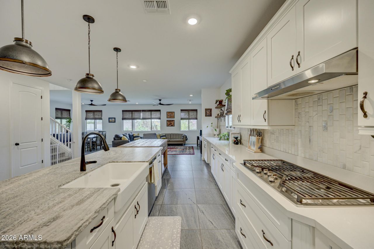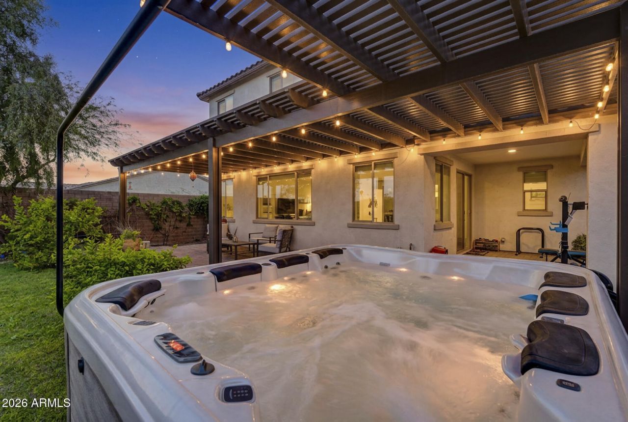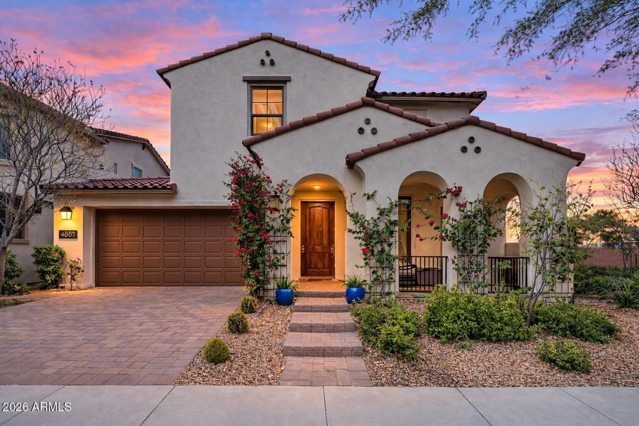 GUEST-SUITE DOWNSTAIRS, CORNER LOT ACROSS FROM THE PARK, BONUS LOFT & DEN, BACKYARD SPA EASY ACCESS TO SHOW! Welcome home to this beautiful residence in the highly sought-after Eastmark Community. Featuring 4 spacious bedrooms, a den, an expansive loft, 3.5 bathrooms, and a 2-car garage, this home offers exceptional style, space, and versatility. Enjoy an inviting front porch with stunning arches adorned by pink bougainvillea vines overlooking a tree-lined park just across the street. Step inside and discover a beautiful morning room and chefs kitchen featuring white shaker cabinets, a Monte Cristo raw-edge granite island, and beautiful snow-white quartz extended countertops. The marble backsplash adds a touch of elegance, while extended cabinetry paired with reclaimed wood floating shelves enhance style and offer an abundance of storage.Take note of the large farmhouse sink, rustic pendant lights, and morning kitchen with an oversized walk-in pantry. This space is truly a culinary haven. The family room flows seamlessly into an extended dining area - perfect for entertaining guests or quiet family dinners. A downstairs guest bedroom with an ensuite bathroom provides privacy and convenience. Upstairs, youll find a spacious and versatile loft. The luxurious primary suite offers a private balcony, an ensuite bathroom with two sinks and a spa-like shower, and a large walk-in closet leading to a beautiful laundry room. The two additional upstairs bedrooms share a Jack-and-Jill bathroom. Outside is a backyard oasis featuring an above-ground Bullfrog spa and a paved seating area with an extended pergola. The lush grassy lawn is home to citrus trees and a 3-year-old Chinese Pistache. The periphery of the backyard is adorned by fig, pomegranate, and other mature trees. Garden beds of varying sizes grow vegetables, herbs, and beautiful perennial and annual flowers, attracting butterflies, bees, songbirds, and hummingbirds. All garden areas include automatic irrigation with Rainbird control, allowing you maximum enjoyment with minimum effort. Eastmark is a highly regarded master-planned community in Mesa, Arizona, known for its thoughtful design, extensive amenities, and community events year-round. Amenities include a resort-style pool, state-of-the-art community center, over 75 neighborhood parks, a splash pad, event pavilion, climbing park, 18-hole disc golf course, and skate park. A short walk from home takes you to the two-acre Steadfast Farm, the Steadfast Diner, Steadfast Coffee Shop, a fishing pond, and newly-built Gateway Library. Eastmarks numerous clubs and programs offer plenty of opportunities to connect with your neighbors, and the 100+ events and activities will keep you entertained year-round.