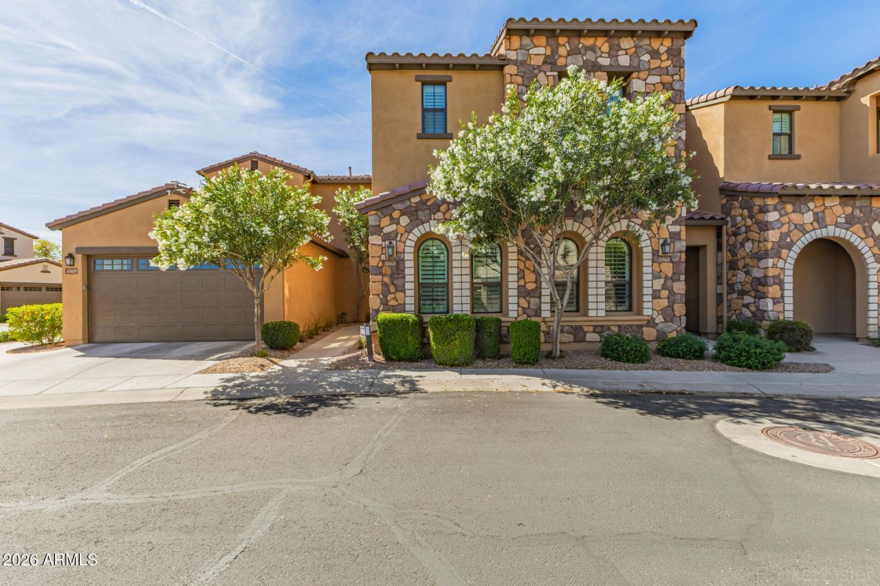 Rare & desirable ground-floor, single-level Villa 2 model in the prestigious gated community of Serenity Shores at Fulton Ranch. Enjoy luxury, security, and convenience with resort-style living. Inside youll find wood-look tile flooring, plantation shutters, high ceilings, and designer lighting throughout. The open layout centers around a gourmet kitchen with upgraded GE Profile stainless steel appliances, gas cooktop, white cabinets with pull-out drawers, granite countertops, subway tile backsplash, and an island with breakfast bar. Spacious living area opens to a private covered patio for relaxing, while a separate dining space is perfect for hosting. Primary suite features dual sink vanity, soaking tub, separate shower, walk-in closet, and direct patio access. Two additional bedrooms and bath are split from the primary for privacy. Attached two-car garage with built-in cabinets and epoxy flooring. Community amenities include heated pool and spa, fitness center, clubhouse, and walking paths. Conveniently located near dining, shopping, golf, and entertainment.