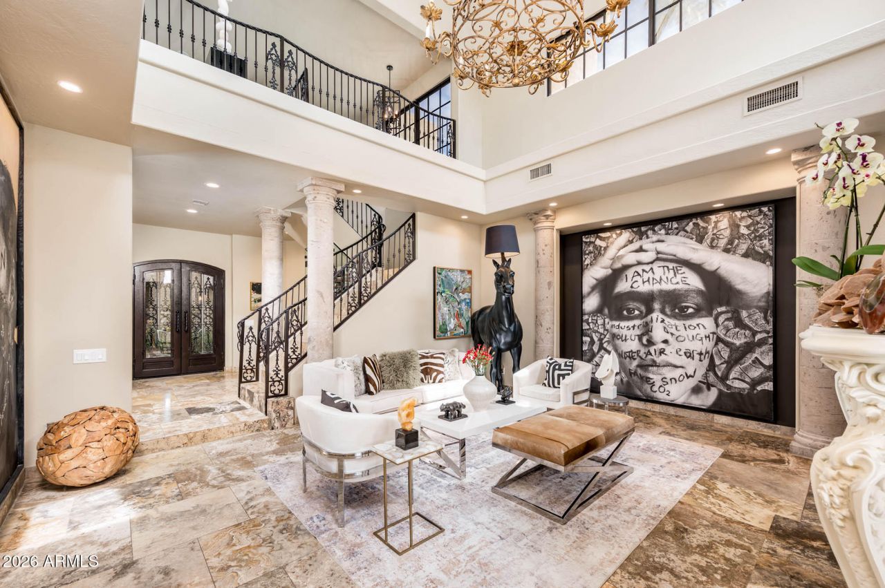 Welcome! Live at the center of Scottsdales most vibrant lifestyle. From Phoenician East, hike Camelback Mountain at sunrise, golf Phoenician course just beyond your patio, shop/dine at Scottsdale Fashion Square, relax at Paradise Valley spas and catch spring training at Scottsdale Stadium. Set on an elevated lot above the fairway, your 2,818-SF residence captures scenic golf course & Camelback Mountain views with exceptional privacy. Dramatic 28 living room ceiling anchors home alongside Brazilian Cristallo Citrino quartzite counters, statement lighting and a sculptural custom wrought-iron. Two oversized primary suites with atelier-styled closets, loft, sunrise deck, elevator, EV charger, induction cooktop, built-in BBQ + private heated pool & spa complete this guard-gated retreat. Resort living, outdoor adventure, and refined city life converge seamlessly here.Within the guard-gated enclave of Phoenician East, this residence occupies an elevated lot overlooking the fairway, positioned approximately four feet above cart path level to enhance both privacy and views. Unlike many homes framed by rooftops or landscaping barriers, this vantage point opens to unobstructed fairway vistas with distant desert mountain horizons. Camelback Mountain anchors the northern skyline, while southeastern views extend across the valley toward the San Tan Mountains nearly forty miles away. The result is a setting defined by openness, light, and visual calm.Inside, the home surprises with architectural volume and scale rarely found in attached residences. A dramatic 28-foot living room ceiling creates an immediate sense of openness and air, allowing natural light to move freely throughout the space. Large sightlines reinforce the sense that the home lives significantly larger than its footprint suggests.Materials and finishes balance contemporary refinement with timeless craftsmanship. Floors are clad in travertine sourced from the Monterey quarry in Mexico, distinguished by subtle blue and gray undertones that lend a cooler, richer palette than traditional warm-toned stone. Lighting has been thoughtfully curated throughout, including sculptural fixtures that punctuate the homes architectural moments.The kitchen is anchored by striking Brazilian Cristallo Citrino quartzite countertops, a luminous natural stone known for its crystalline depth and warm translucence. An induction cooktop brings modern performance to the space, while adjacent entertaining areas transition seamlessly to outdoor living.Two oversized primary suites provide exceptional flexibility and comfort. Each features atelier-styled closets, thoughtfully designed with integrated drawers and display niches to maximize both storage and visual organization. The upstairs primary suite enjoys sunrise light and elevated views toward Camelback Mountain, while the lower suite opens conveniently to outdoor living spaces.Additional interior features include a loft and sunrise deck, ideal for morning coffee, reading, or quiet reflection as desert light unfolds across the valley. A residential elevator enhances convenience and accessibility across levels, while an electric vehicle charging station in the garage supports modern mobility.Outdoor living is equally compelling. A private heated pool and spa offer year-round enjoyment, positioned to capture both sunlight and the tranquil rhythm of the adjacent fairway. A built-in BBQ and entertaining terrace allow gatherings to flow naturally from indoors to out. The entry sequence is framed by a private co