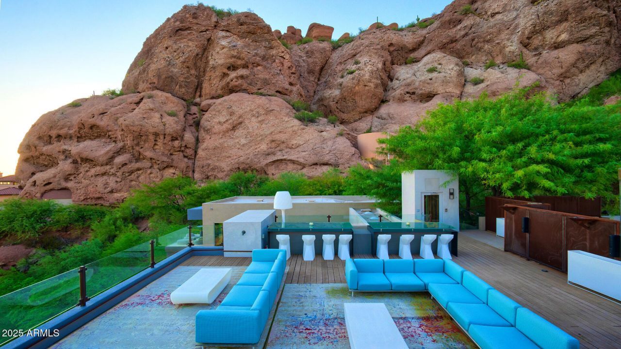 Come experience this breathtaking hillside home. Red Rocks of Camelback provide a backdrop for the extraordinary architecture with elements that blend beautifully into the scenery and elements that provide exceptional juxtaposition with contemporary flair. Views are panoramic, and luxury finishes and furnishings are over the top. Just a few of the incredible features include the infinity edge pool, cantilevered guest house, in-house bar with frozen rail, game room with red rock climbing wall, rooftop seating and fire features, tiered putting greens and several massive waterfalls. Epic is just the beginning.