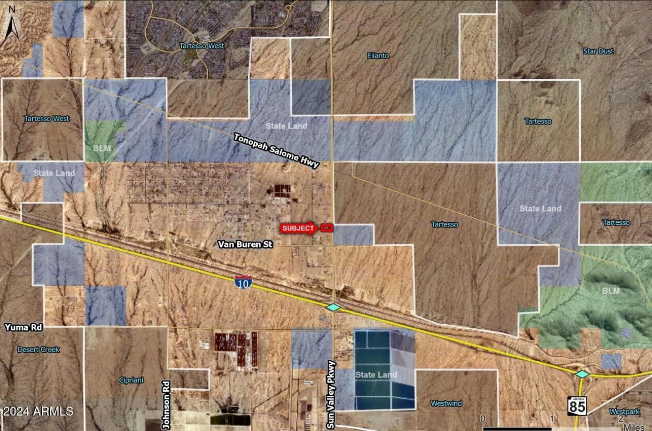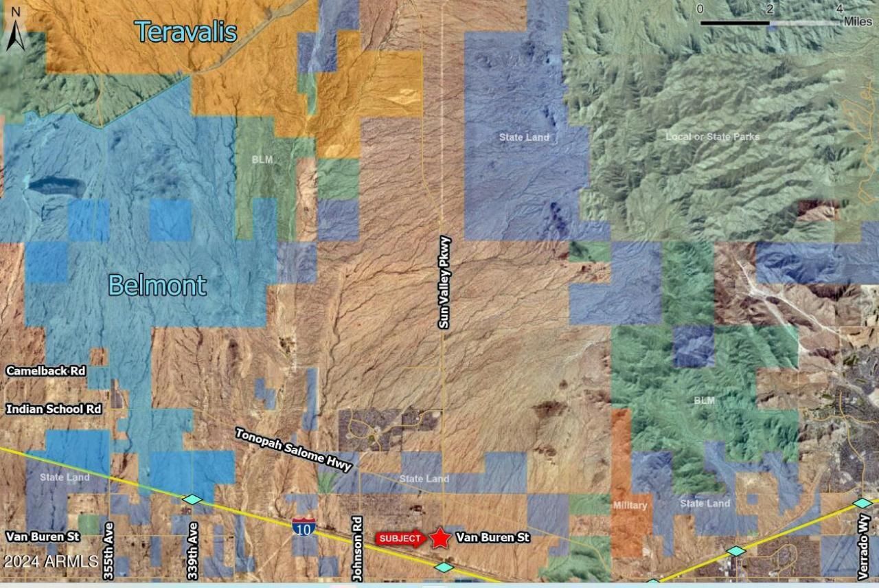 Excellent opportunity to develop commercial space in a vastly underserved part of West Buckeye.Over 330 of Sun Valley Pkwy Frontage.Ability to exclusively serve the entire localpopulation, including the sold out 2,918 lot Tartesso Community to the North, the 336 lot West Phoenix Estates community to the West, as well as the incoming 100,000 home Teravalis community, whosresidents will all access their homes via the SunValley Pkwy. As of today, the entire existing localpopulation (approximately 10,000 people) travel toI-10 & Watson for the nearest commercial service.Teravalis, formerly known as Douglas Ranch, began construction on 10/28/2022 and will reportedly create 1.5 jobs for every home.