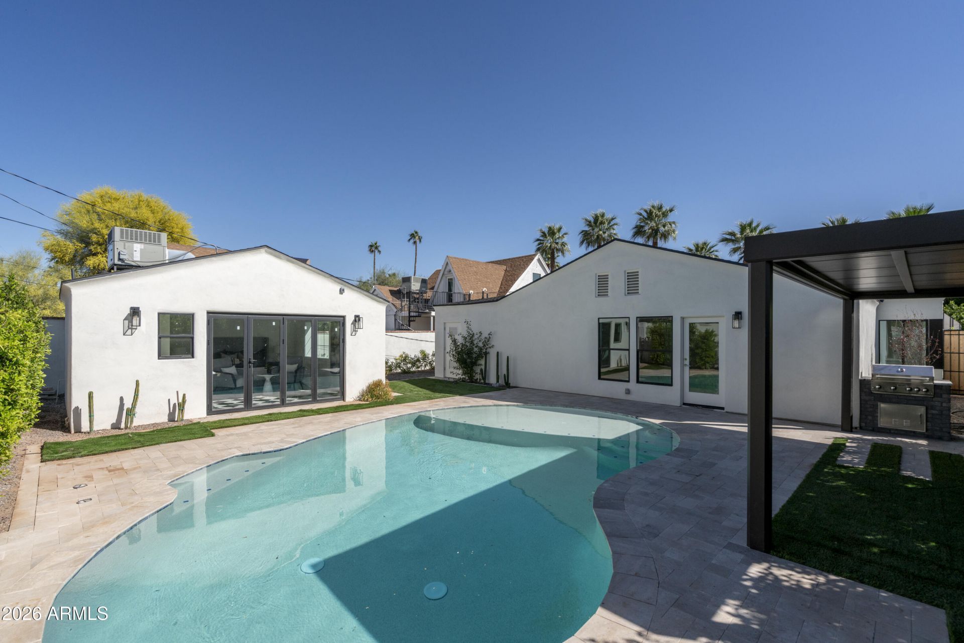 Rare opportunity to own this 1940s-built residence that has been meticulously updated from top to bottom, offering a seamless blend of vintage soul and contemporary luxury in the coveted Willow Historic District. The light-filled living room retains its cozy charm with a classic wood-burning fireplace, while all-new flooring transitions smoothly into the dining and kitchen designed for both function and style. Enjoy brand-new, stainless steel appliances, quartz countertops, and new cabinets along with a large walk-in pantry. The large peninsula can accommodate 5 barstools , perfect for morning coffee and the dining area is perfect for entertaining. Designed for both privacy and hosting, the main home features a sprawling master complete with a fully remodeled master bathroom. Two additional bedrooms in the main house each feature their own ensuite bathrooms. Step outside to your own private resort. The backyard is anchored by a sparkling sapphire pool, perfect for the Arizona summer. Beyond the pool sits the detached guest casita, a fully self-contained sanctuary featuring the 4th bedroom and 4th bathroom. Whether used as a high-end guest suite, pool house, a quiet home office, or a rental opportunity, this space adds incredible value and versatility. Experience the charm of the 1940s with the reliability of a new remodel, brand-new roof, high-efficiency HVAC system, updated electrical, all-new plumbing, & new interior/exterior paint. Welcome home! Square Footage listed includes Casita.