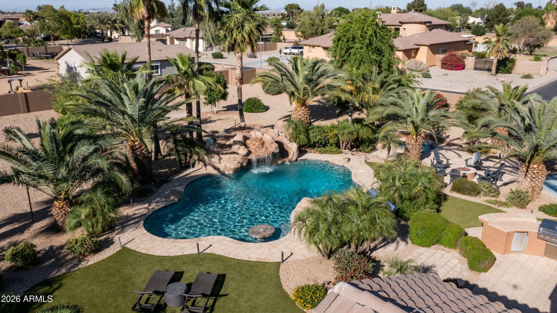 This isnt just a home--its your own private resort. Completely renovated from top to bottom, this turn-key irrigated equestrian property gives you that brand-new feel without sacrificing the charm of an established setting. Inside, youll find custom knotty alder millwork, a true chefs kitchen with premium appliances (including a 60-inch refrigerator), a butlers pantry, new porcelain tile, new carpet, and beautifully updated bathrooms throughout. The big-ticket items are already done: new dual 5-ton HVAC units with upgraded insulation, tankless water heater, and a new pool pump and heater. Youll also appreciate the downstairs primary suite, a private casita with full bath, automated blackout blinds, home theater audio, and fresh paint throughout. And while it feels like a private escape, your right where you want to be--centrally located with quick access to the 202, making it easy to get anywhere in the Valley. Step outside and it only gets better. Set on a fully landscaped acre, the backyard is designed to feel like a true escape. Palm trees sway, fruit trees line the property, and everything centers around a custom diving pool with a grotto and slide. Theres a splash pad for the kids, a fire pit for evenings under the stars, and an oversized 8-person hot tub built for relaxing or entertaining. Whether youre hosting, unwinding, or just enjoying a quiet morning, this property delivers a lifestyle most homes cant touch. Its not just a backyard--its a destination.